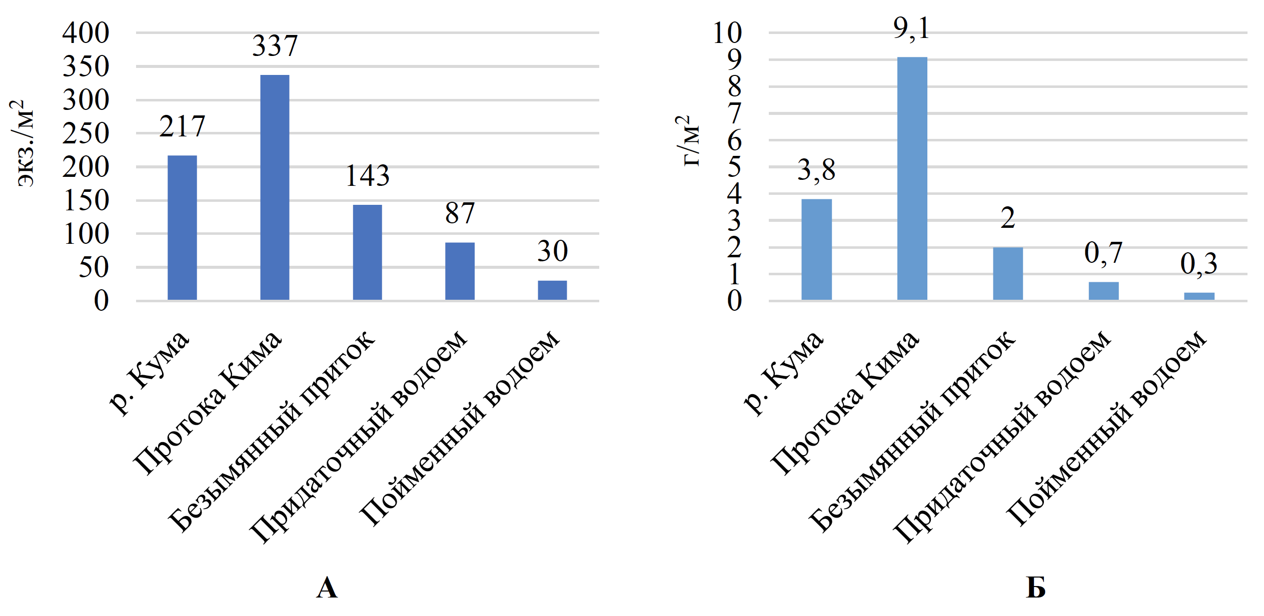 Наибольшая плотность пресноводных моллюсков в макрозообентосе бассейна р. Кума по числу особей и биомассе зарегистрирована в протоке Кима, наименьшая – в пойменном водоеме (рис. 4).