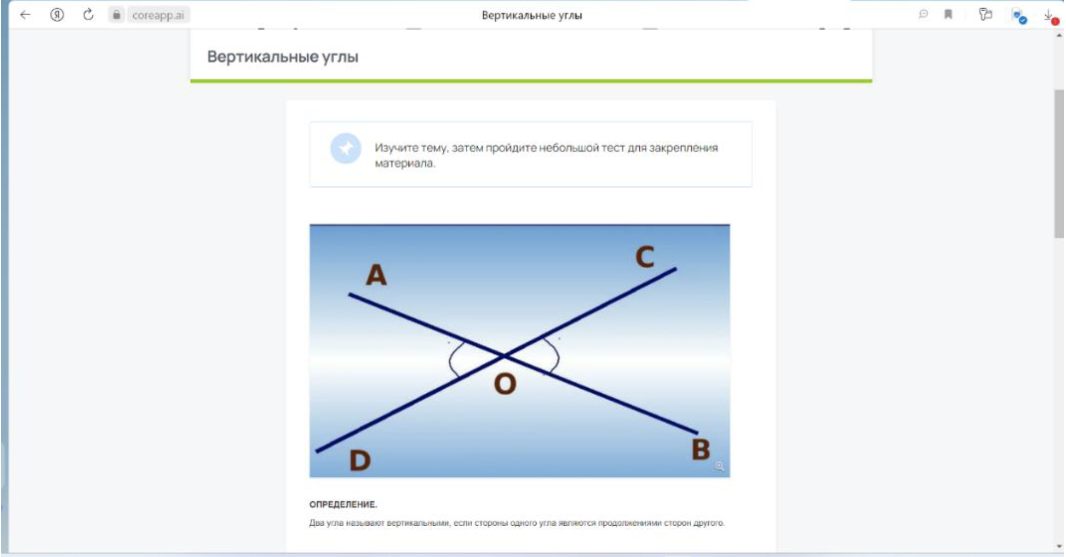 Продемонстрируем пример использования платформы CoreApp на уроке геометрии в 7 классе при изучении темы «Вертикальные углы» на этапе включения в систему знаний и повторения (рис. 5).