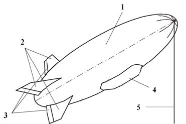 газом – гелием или его смесями [2]. На пути технологического прогресса, современный аэростат находится между тепловыми аэростатами и дирижаблями, однако для целей дистанционного зондирования он обладает более низкой стоимостью при отсутствии главного отличия от дирижабля – аэростат является неподвижным объектом, что, однако, может иметь и свои преимущества. Упрощённая схема строения аэростата представлена на рисунке 1, где 1 – оболочка аэростата, 2 – консоли оперения, 3 – рули, 4 – подвес полезной нагрузки, 5 – удерживающий трос и кабель питания.