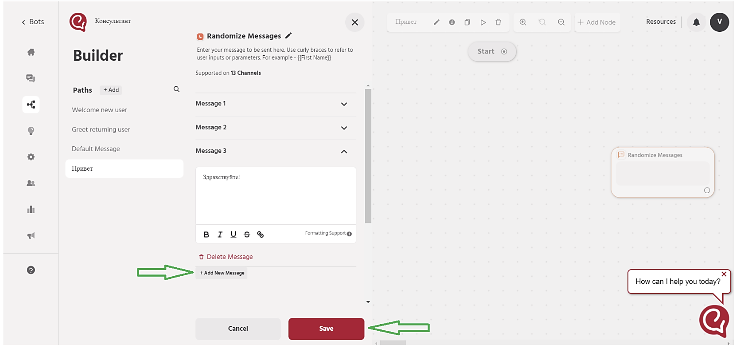 - Задайте действия бота для категории приветствия. Для этого щелкните на команду Add (Добавить) и в появившемся окне задайте название этой категории, например, назовите эту цепочку «Привет». Нажмите на кнопку Create path и убедитесь, что новая категория «Привет» появилась в общем списке. Выберите тип сообщения от бота для категории «Привет». Для этого нажмите на кнопку Add Node (Добавить узел). В открывшемся окне можно увидеть все шаблоны для действий бота. Для ответа на приветствие выберите шаблон Randomize Messages (Случайные сообщения). В открывшемся окне последовательно внесите из заранее подготовленной таблицы все варианты приветствия со стороны бота. Для добавление нового варианта используйте кнопку Add New Message (Добавить новое сообщение). В итоге должно появиться три варианта сообщения. В завершении нажмите кнопку Save (Сохранить) (рис. 1).