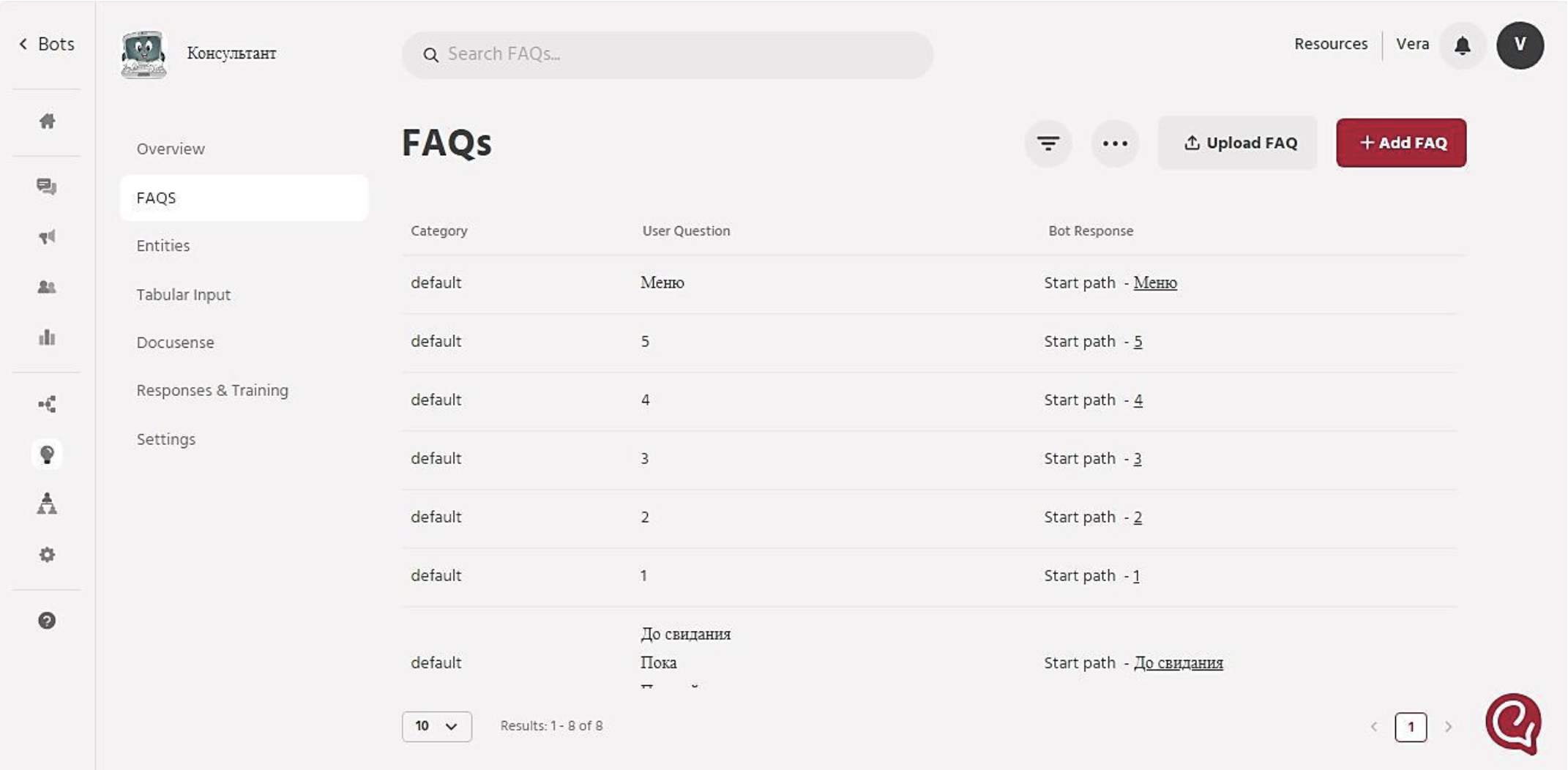 Рис. 2. Пример внесения вопросов пользователя в чат-бот Engati