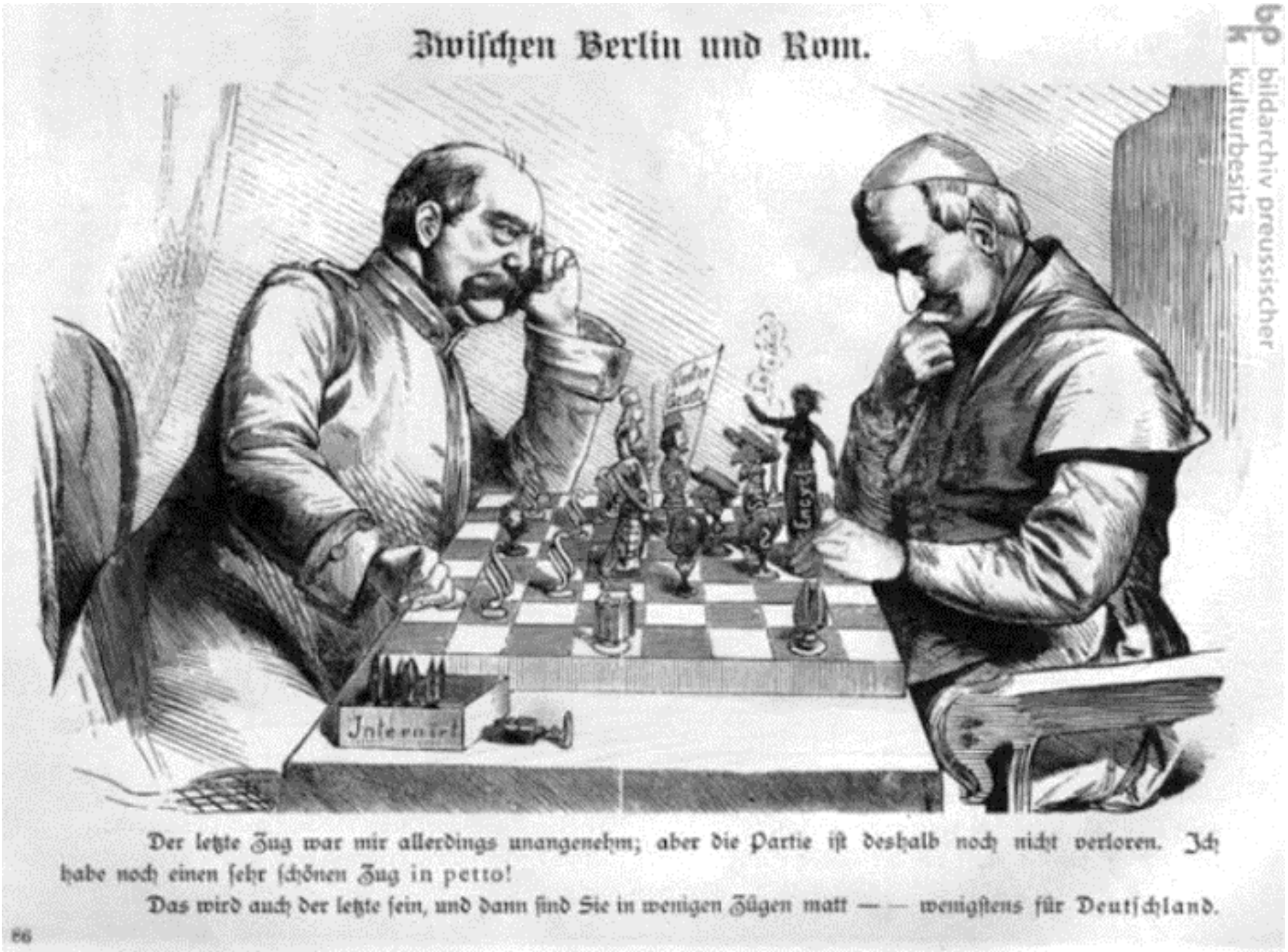 В 1875 г. в немецком литературно-художественном иллюстрированном журнале политической сатиры «Кладдерадатч» («Kladderadatsch») представлен рисунок Вильгельма Шольца «Между Берлином и Римом» (рис. 1). В. Шольц сатирически изобразил культуркампф как шахматную игру между Бисмарком и папой Пием IX.
