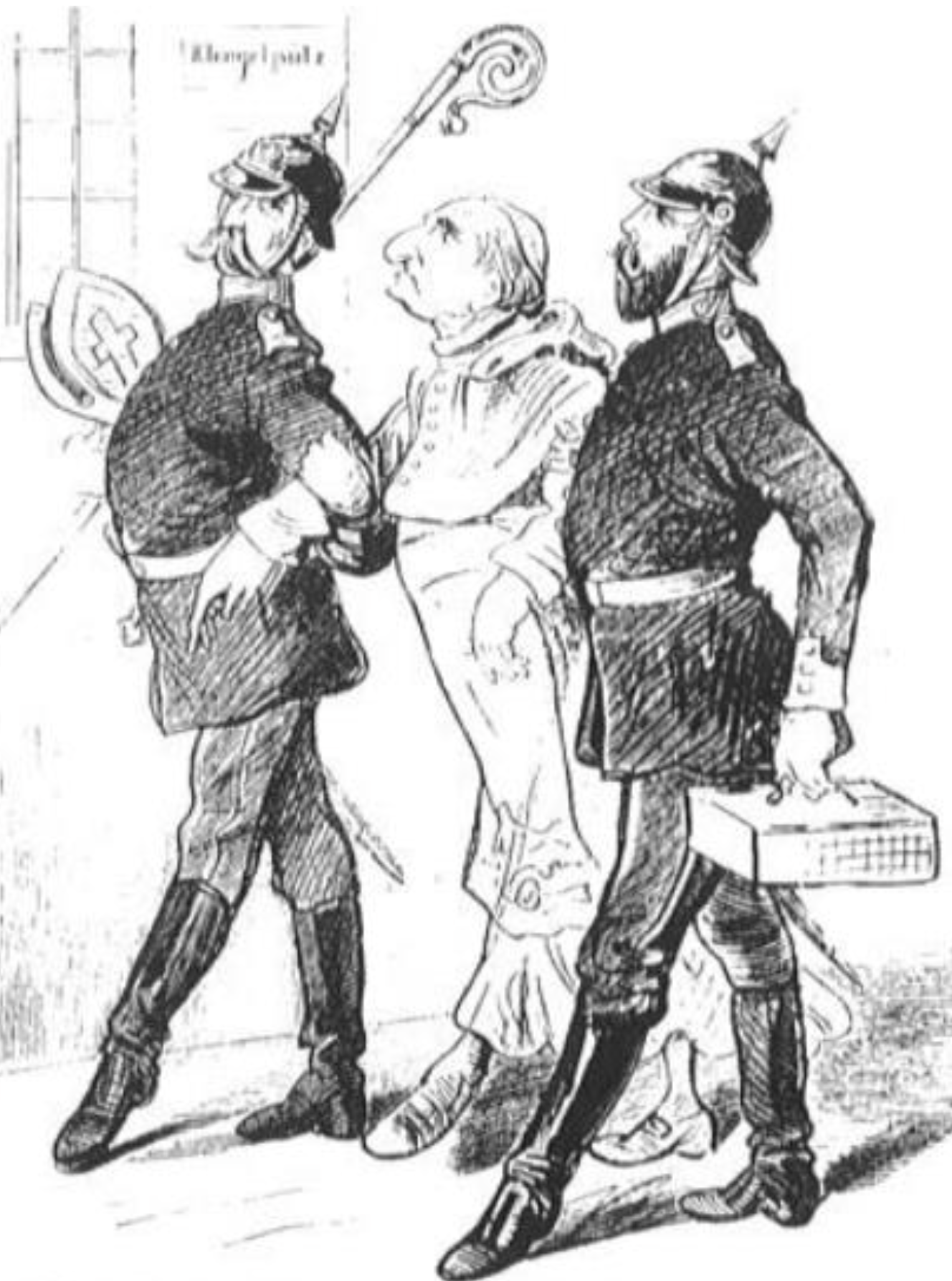 С помощью острых карикатур прусско-протестантский национализм пытался бороться с влиянием католического ультрамонтанства, представленного партией Центра, которая получила наибольшую поддержку в Рейнской области. Возглавляемое Бисмарком правительство принимало одним за другим многочисленные законы, направленные на ограничение власти католической церкви. Так, в 1871 г. законом, направленным против католических проповедников («Kanzelparagraph»), были запрещены политические темы в проповедях. В 1872 г. был запрещен орден Иезуитов, в результате чего оборвались дипломатические связи Германии с Ватиканом, и принят «Закон о школьном надзоре», согласно которому контроль церкви над школой был заменен государственным. «Майскими законами» 1873 г. государство добилось контроля над образованием духовенства и назначением их на должности [2]. В 1875 г. был введен «гражданский брак» и принят так называемый закон о хлебной корзине («Brotkorbgesetz»), предусматривавший запрет выделять для Римской католической церкви помощь из государственных средств [5, s. 214]. Давление со стороны германского правительства не могло не вызвать ответную реакцию папы Римского, особенно после ликвидации Папского государства Итальянским королевством в 1870 г. В результате папа Пий IX имплементировал в 1870 г. в рамках I Ватиканского собора догмат о непогрешимости папства («Unfehlbarkeitsdogma»), в чем Бисмарк усмотрел прямой вызов светской власти [3, s. 93].