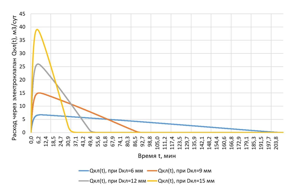 Рис. 3. Зависимость расхода жидкости через электроклапан по времени при различных значениях диаметра проходного сечения электроклапана