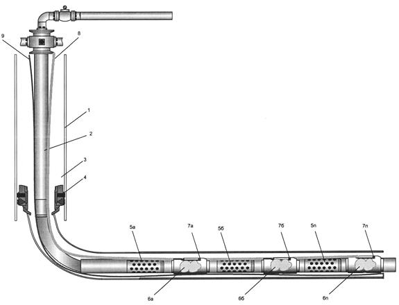 Рис. 1. Схема измерения дебита скважины [6]. 1 – скважина; 2 – НКТ; 3 – затрубное пространство; 4 – пакер хвостовика; 5а–5n - перфорированные трубы; 6а–6n – охлажденные метки; 7а–7n – сужающие устройства (дроссели); 8 – трубка подачи газа; 9 – оптоволокно