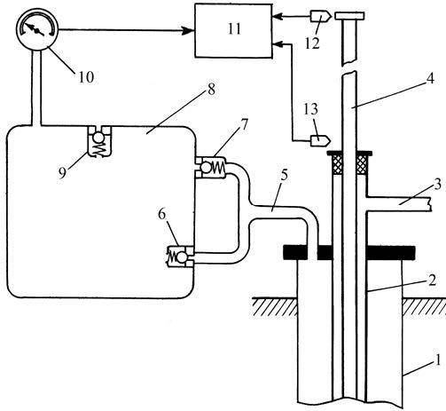 Рис. 2. Схема определения дебита скважины [5]. 1 – обсадная труба; 2 – насосно-компрессорная труба; 3 – выкидная линия; 4 – полированный шток; 5 – патрубок; 6 – впускной клапан; 7 – выпускной клапан; 8 – мерная ёмкость; 9 – впускной клапан; 10 – манометр; 11 – вычислительный блок; 12 – датчик верхнего положения штока; 13 – датчик нижнего положения штока