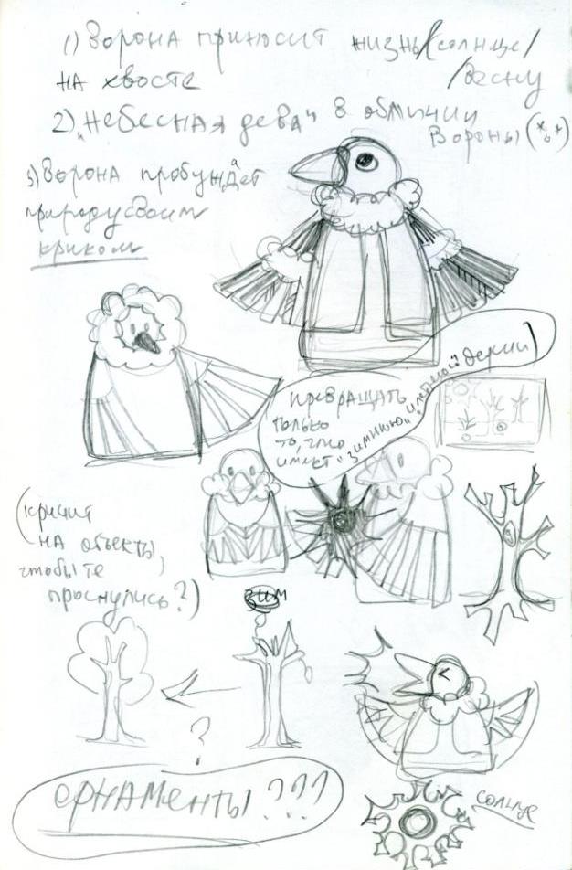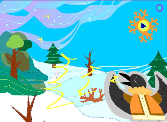 В качестве основы сюжета для нашего игрового проекта мы взяли одну из интерпретаций легенды о Вороне, которая призывает своими криками весну. По одной из хантыйских легенд земля покрылась трескучими морозами, опустилась вечная ночь, бушевали ураганы и метели, которые довели людей до отчаяния. Долго длилось это горе, но однажды залетела в эти края Ворона и, увидев пустую тихую землю вокруг, испугалась и изо всех сил крикнула. Так силен и громок был ее крик, что проснулась природа, засияло солнце, растаяли снега, – все живое пробудилось [4].