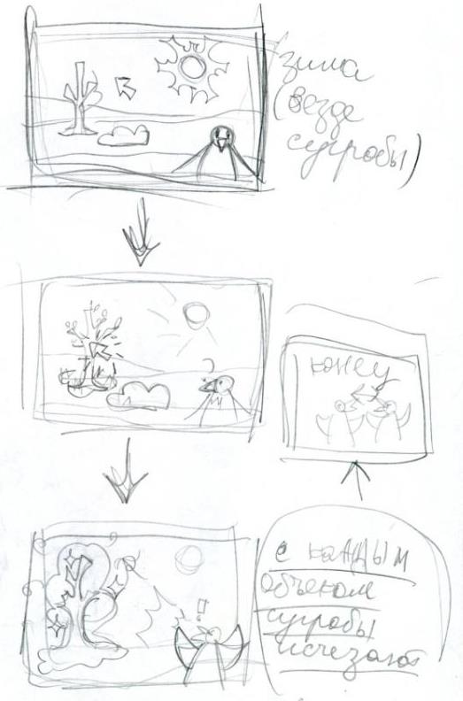 Первый этап заключался в продумывании игрового процесса, в постановке понятных целей и задач перед игроком, в выстраивании композиции кадров (фреймов) и логики происходящего. Было решено, что главная цель игрока – помочь главной героине, Вороне, пробудить природу от зимнего сна. Как можно увидеть на раскадровке, представленной ниже, геймплей представляет из себя довольно простой алгоритм: игрок видит покрытые сугробами предметы, кликает на них – и Ворона кричит на предметы, меняя их на «весенние» версии.