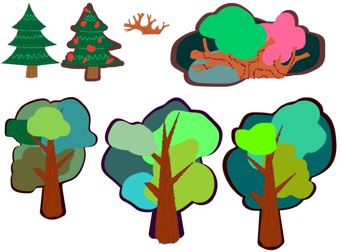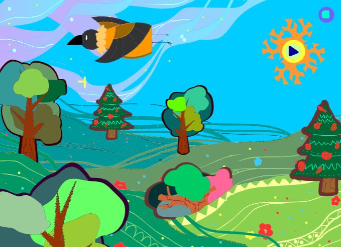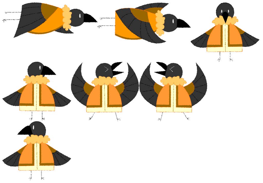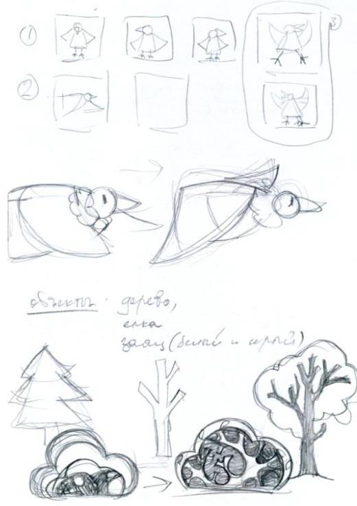 Третий этап – создание элементов игры: фреймы с вороной, элементы фауны и флоры, «зимний» фон и «весенний» фон. Главной задачей на данном этапе было создать простые элементы, с которыми можно было бы легко манипулировать на этапе разработки, но которые бы одновременно с этим выражали и основную идею, стоящую за каждым фреймом. Так, например, Ворона представлена в виде семи фреймов, каждый из которых отвечает за определенные эмоцию и движение.