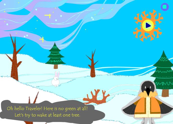 Рис. 8. Фрейм с “зимним” миром (надпись: “Ох, привет, путешественник! Что-то здесь совсем нет зелени. Давай попробуем пробудить хотя бы одно дерево.”) (https://clck.ru/38qn2g)