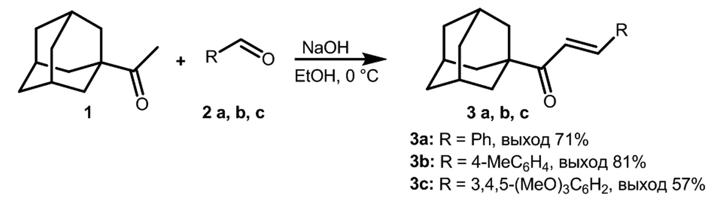 Результаты. На первом этапе осуществляли синтез α,β-ненасыщенных кетонов 3a-c перекрестной альдольной конденсацией ароматических альдегидов 2a-c с адамантилметилкетоном 1 в водно-спиртовом растворе в присутствии гидроксида натрия при 0 °С.