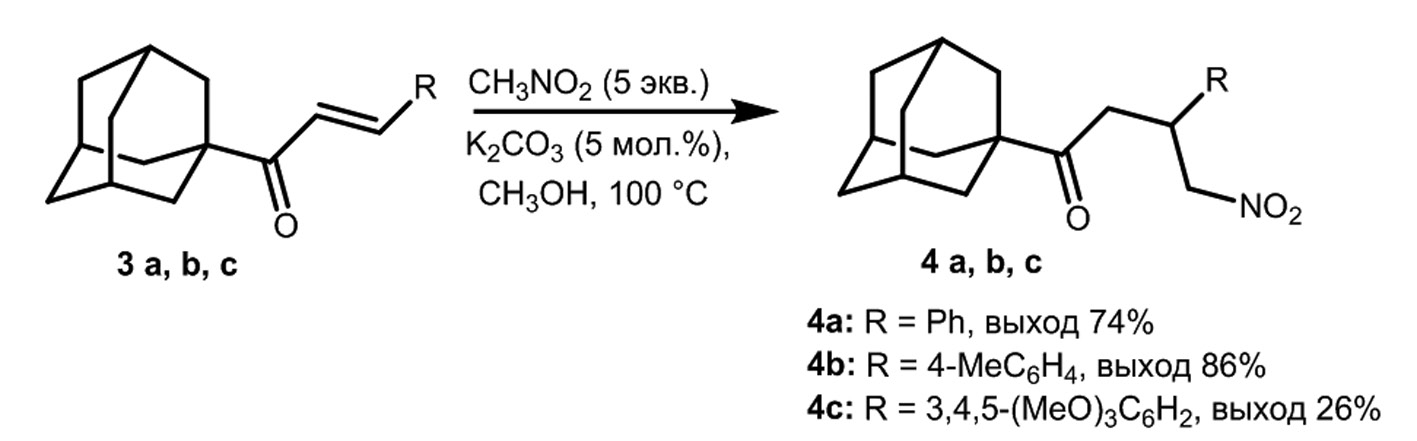 Далее к α,β-ненасыщенным кетонам 3a-c присоединяли нитрометан по реакции Михаэля. Реакция протекала в присутствии карбоната калия в качестве катализатора. Синтез осуществляли в автоклаве при 100 °С. В результате были получены аддукты Михаэля 4а-c.