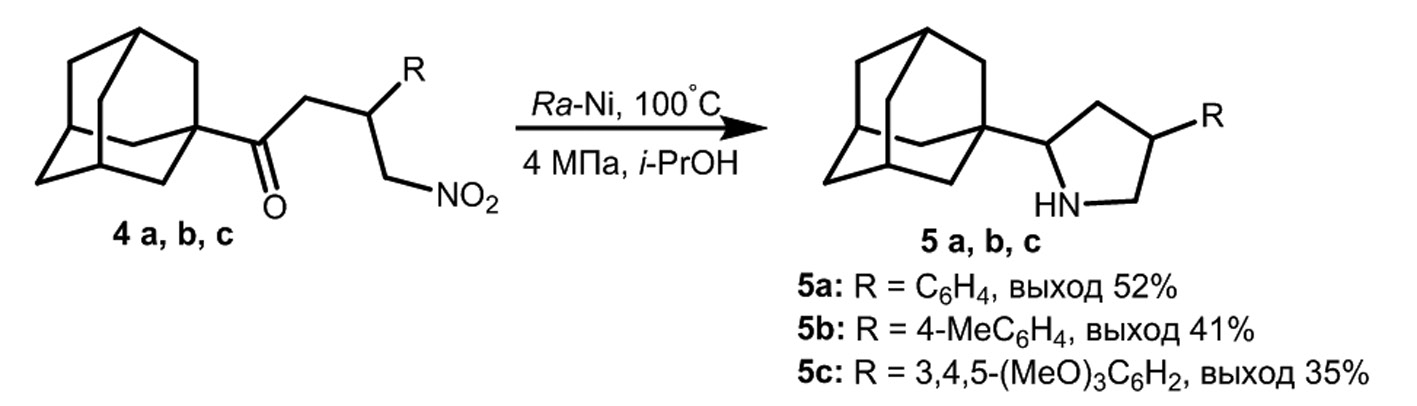 γ-Нитрокетоны 4a-c подвергали восстановительной циклизации. Гидрирование проводили в изопропаноле при 100 °С при избыточном давлении водорода 4 МПа в присутствии никеля Ренея. Реакция приводит к адамантилзамещенным пирролидинам 5a-c.
