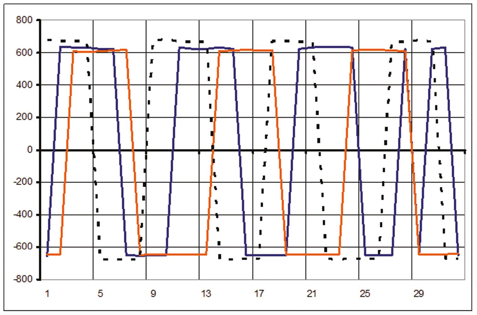 Рис. 1. Сила тока, подаваемая на магнитные исполнительные органы опытного образца малого космического аппарата «Аист» по данным телеметрической информации