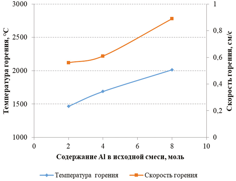 Экспериментальное исследование влияния соотношения исходных компонентов на температуру (TГ) и скорость (UГ) горения систем для получения целевой нитридно-карбидной композиции AlN-SiC, проводилось на образцах цилиндрической формы диаметром 30 мм и высотой 45 мм при давлении внешнего азота в реакторе 4 МПа и насыпной относительной плотности 0,34-0,40. Исследование размера и морфологии конечных продуктов проводилось с использованием растрового электронного микроскопа JSM-6390A фирмы «Jeol», обладающего высокой разрешающей способностью и глубиной резкости. Фазовый состав продуктов синтеза определяли на автоматизированном рентгеновском дифрактометре ARL X'TRA фирмы «Termo Sсientific».