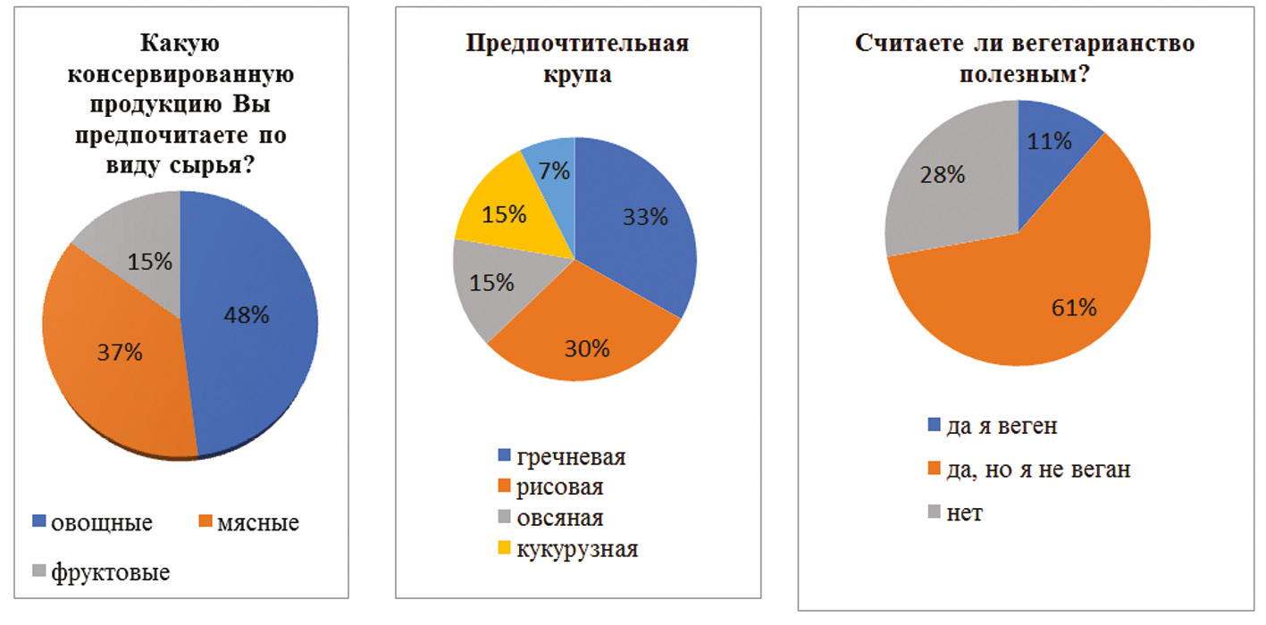 Результаты. Для выявления предпочтений потребителей были проведены маркетинговые исследования с помощью анкетного опроса. В анкете были отражены наиболее важные вопросы для составления диаграмм, отражающих предпочтения потребителей. Из всех опрошенных 100 % питаются консервированной продукцией. Визуализация результатов представлена на рисунке. Подводя итоги исследования, можно сделать следующие выводы: