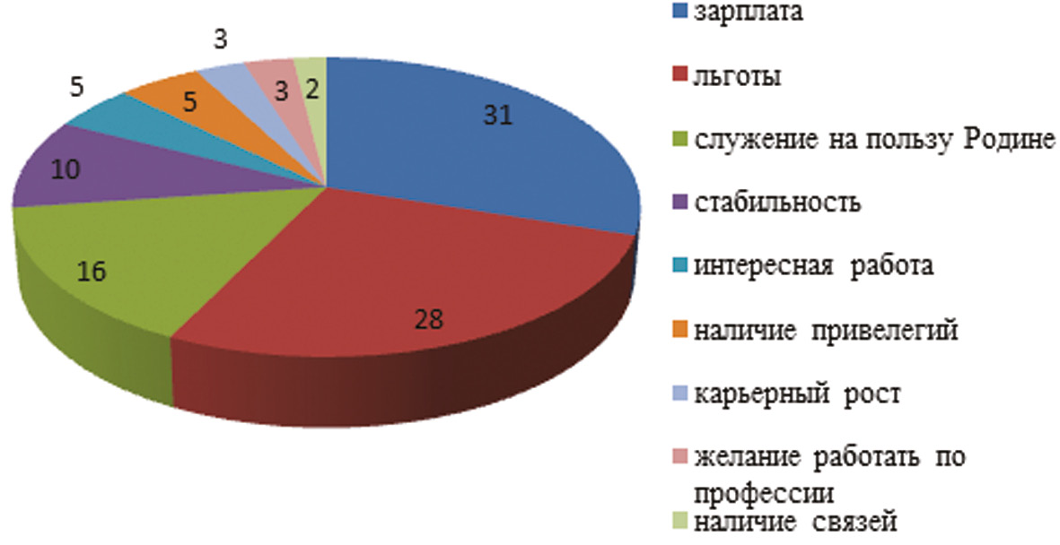 Работа в государственных органах в настоящее время приобретает более привлекательный вид. По данным Центра изучения общественного мнения [3], мотивами для трудоустройства на работу в государственные органы считается заработная плата, наличие привилегий и льгот, а также возможность приобрести выгодные связи. Несмотря на то что в теории среди молодежи почти каждый третий желает работать в государственных органах, на практике заинтересовать и удержать квалифицированных сотрудников (особенно на муниципальном уровне) достаточно сложно.