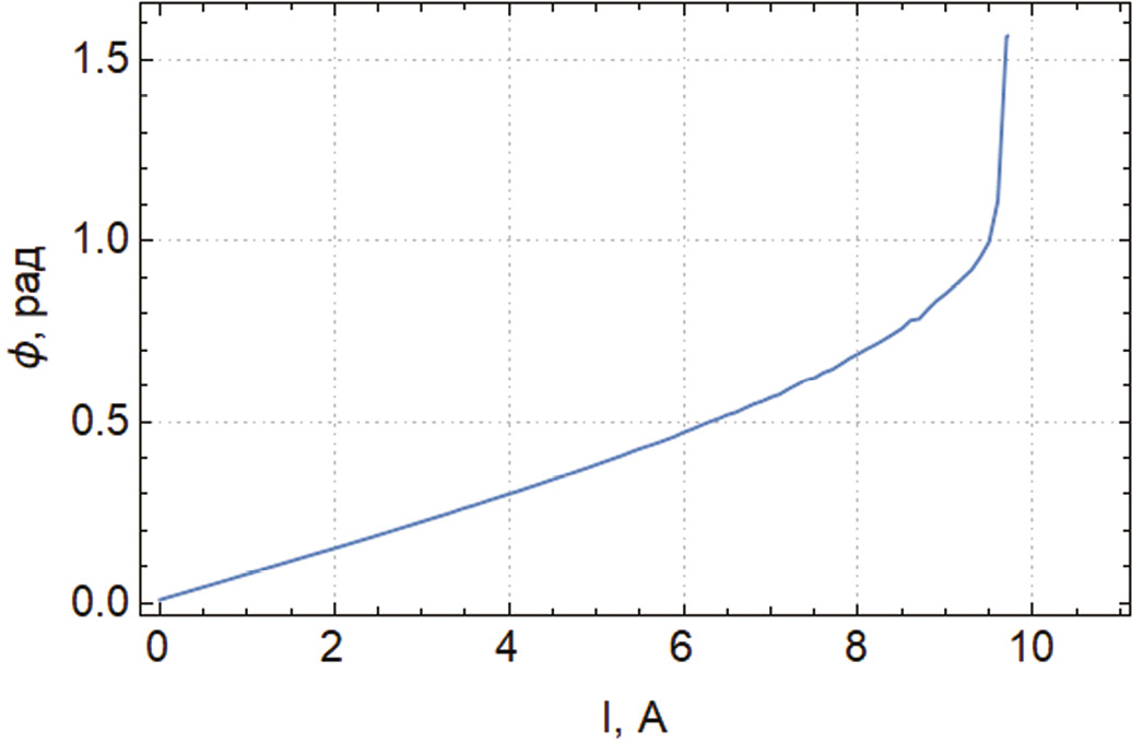 Рис. 3. Зависимость максимальных углов отклонения троса от силы тока при переходе во вращение