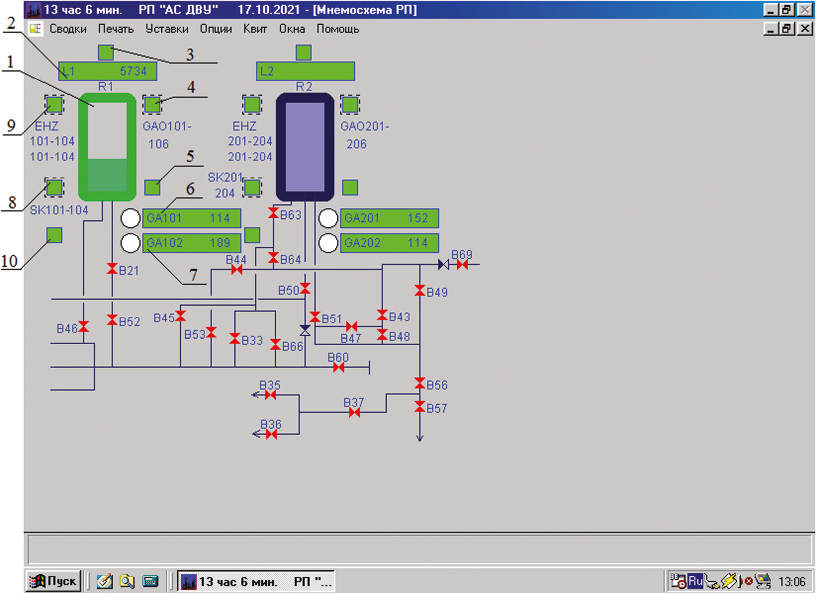 Рис. 2. Общая мнемосхема резервуарного парка: 1 — резервуар; 2 — индикатор уровня взлива в резервуаре; 3 — сигнализатор выхода уровня взлива за нижнюю границу интервала; 4 — общий сигнализатор датчиков в обваловании о выходе загазованности за верхнюю границу интервала; 5 — сигнализатор загазованности от датчика в колодце обнаружения утечки; 6 — индикатор загазованности в колодце обнаружения утечки; 7 — индикатор уровня загазованности в канализационном колодце; 8 — сигнал от датчика скорости коррозии; 9 — общий сигнализатор от электродов сравнения электрохимической защиты днища резервуара; 10 — сигнализатор о максимальной вероятности появления утечки из резервуара