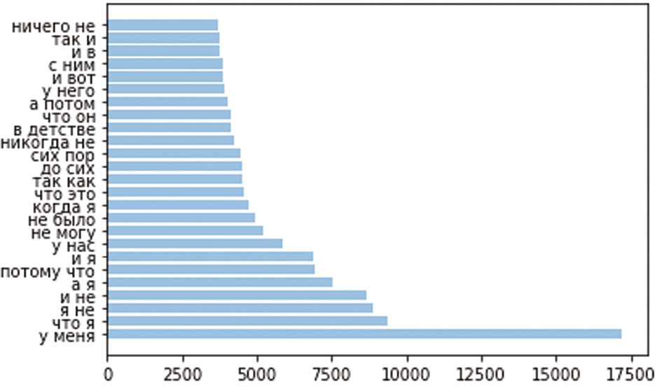 Для дальнейшего анализа текст был разбит на N-граммы — последовательность из N элементов строки. В данной работе — на биграммы (последовательность из двух элементов). Были найдены самые частые в использовании биграммы (рис. 1).