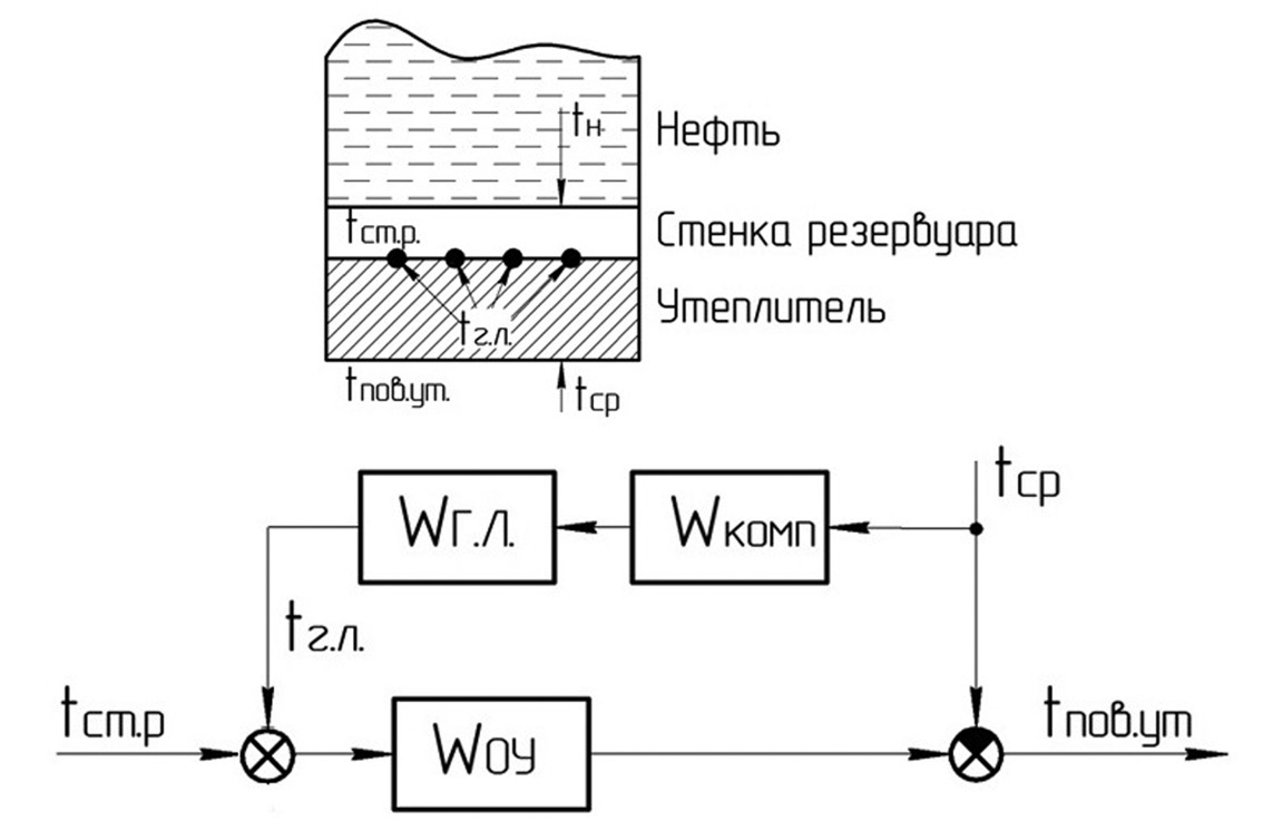 В приведенной на рис. 1 системе в качестве объекта управления (Wоу) использован утеплитель, который рассматривали как объект с распределенными параметрами, так как необходимо учитывать процесс передачи тепла от одного крайнего слоя утеплителя к другому. Wкомп — это компенсирующее устройство, температура окружающей среды tср — помеха, управляющее воздействие tг.л. — температура греющей ленты, tпов.ут — выходная величина.