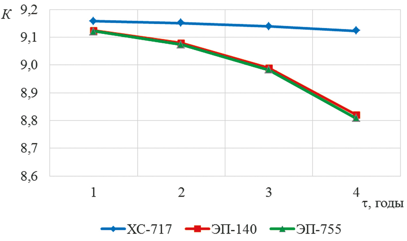 Рис. 2. График изменения коэффициента защитной способности ЛКП в ходе эксплуатации РВС