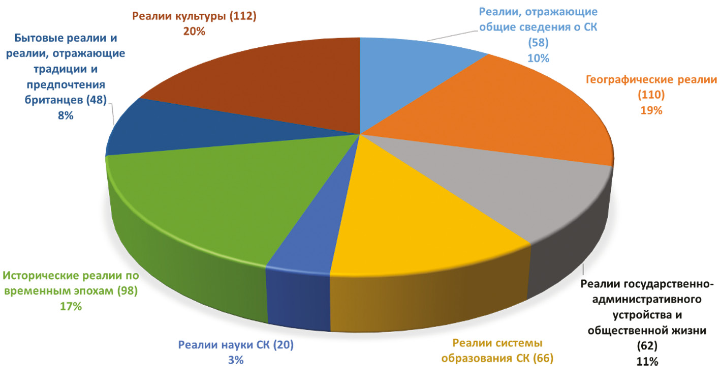 Методы. Поскольку одна из главных проблем, возникающих при изучении реалий — это сложность их систематизации, мы посчитали целесообразным использовать метод классификации и представить собственную развернутую классификацию реалий Соединенного Королевства Великобритании и Северной Ирландии (СК), в основе которой лежит принадлежность к различным тематическим группам. Для определения соотношения реалий в своих тематических группах и по типам классификаций, мы, используя статистические методы, посчитали количество реалий в собственном глоссарии.