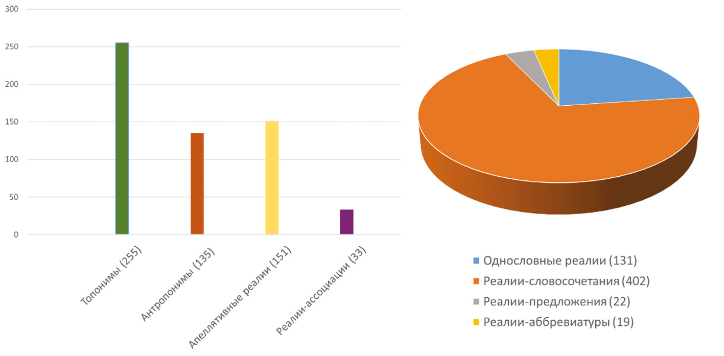 К самым большим тематическим группам реалий, представленных в глоссарии, можно отнести реалии культуры, географические и исторические (рис. 1). По типологическим признакам наиболее часто встречающимися реалиями были ономастические, представленные топонимами и антропонимами; аппелятивные и реалии-ассоциации представлены в меньшем количестве, по составу же наиболее большой сегмент занимают реалии-словосочетания (рис. 2).