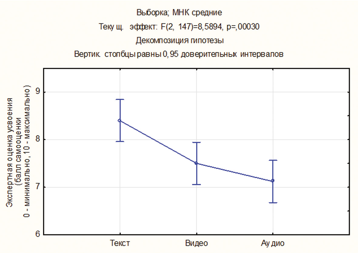 На рисунке приведены результаты дисперсионного анализа, установлены значимые различия: усвоение, по мнению эксперта, лучше при текстовой презентации учебной информации. Аналогично считают и студенты: установлены различия в когнитивном параметре самооценки восприятия, то есть они узнают больше при чтении, чем при видео- и тем более при аудиопрезентации.