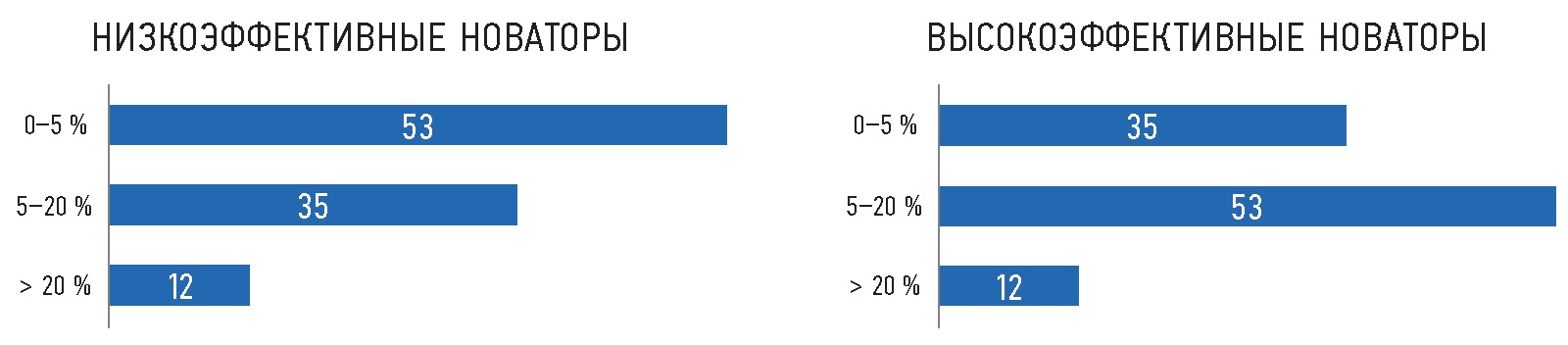 На основе анализа данных крупных международных компаний, проведенного консалтинговой компанией McKinsey [2], выявлена существенная необходимость в перераспределении бюджетных средств компании на исследования и разработки в области инновационного развития (рис. 2). Из данного анализа следует, что большая доля высокоэффективных новаторов стараются перераспределить на исследования и разработки инноваций 5–20 % своего бюджета. Низкоэффективные новаторы перераспределяют в основном 0–5 % своего бюджета. Соответственно крупные компании, которые перераспределяют большую долю бюджета лучше совершенствуются и достигают своих целей в реализации долгосрочных инноваций.