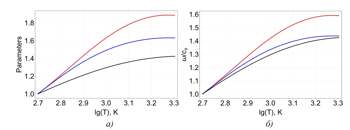 С помощью решений нелинейного акустического уравнения [2] и более точного метода, основанного на использовании адиабат [3], были произведены оценки амплитуды плотности автоволнового импульса (см. рисунок, а) и величины скорости распространения волны (б) в зависимости от температуры. При расчетах использовалась модель нагрева и охлаждения среды из работы [6], применимая для ОФД Orion Bar. На графиках указаны только зоны, в которых соблюдается условие изоэнтропической неустойчивости.
