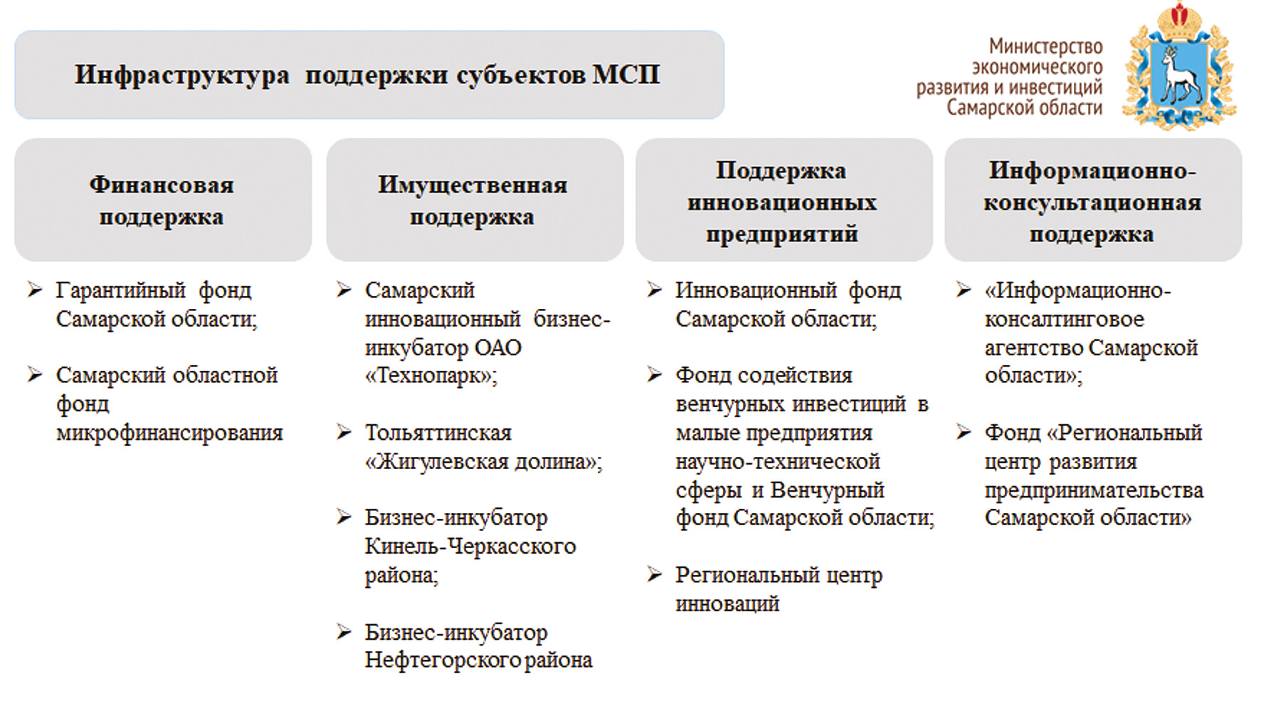 Чтобы обеспечить благоприятные условия для занятия предпринимательской деятельностью, Правительство области утверждает государственную программу по развитию МСП. Министерством формируется и координируется система направлений инфраструктуры государственной поддержки МСП в Самарской области (см. рисунок) [3].