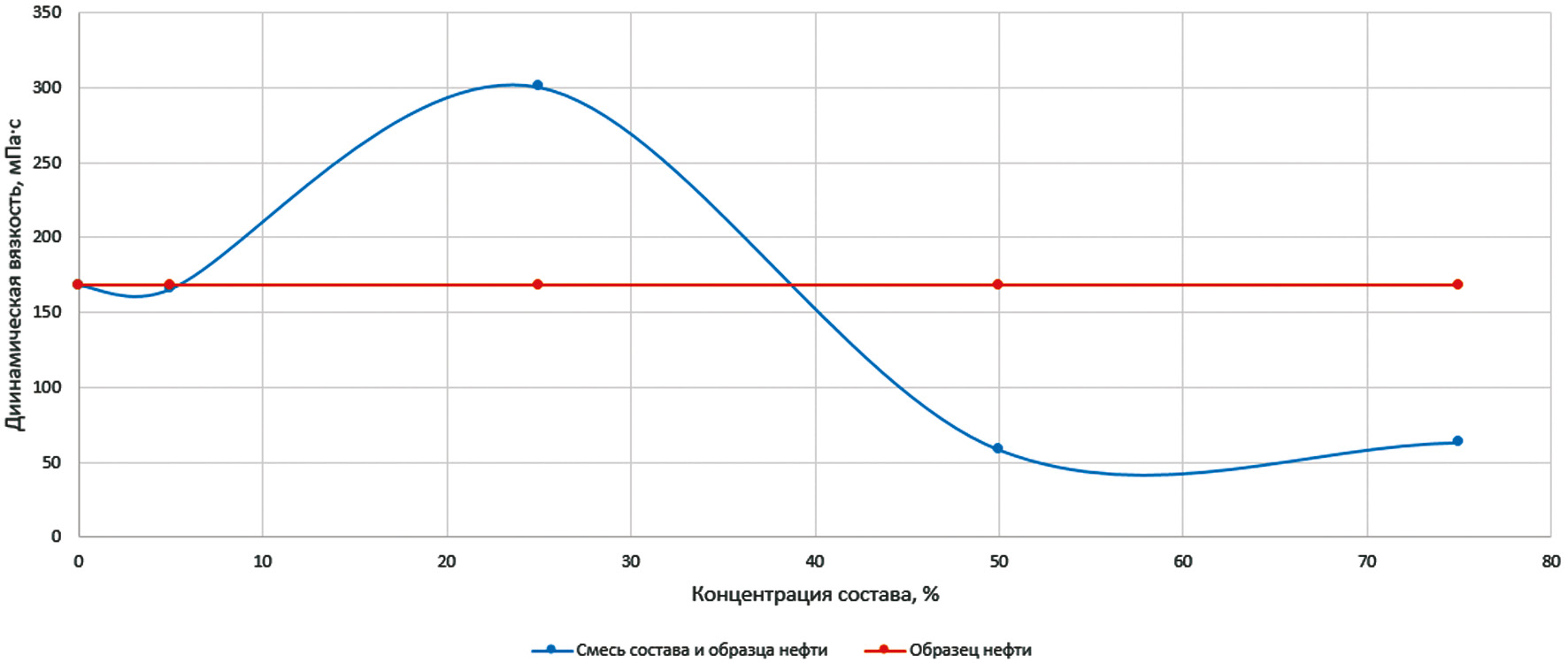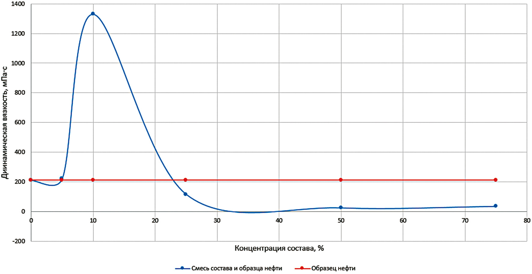 В результате полученных данных наблюдается возникновение эмульсий при смешении разработанного состава и нефти, динамическая вязкость смеси значительно увеличивается и может достигать значений 1329 мПа · с. Можно предположить, что вероятной причиной образования обратной эмульсии становится образование структуры мелкодисперсных капель дисперсной фазы в результате их спонтанного зарождения при явлении самоэмульгирования. Следовательно, при подборе состава и концентрации поверхностно-активного вещества для интенсификации притока нефти следует быть осторожными, чтобы не допустить образования эмульсии в призабойной зоне пласта, стволе скважины и системе сбора продукции и подготовки.