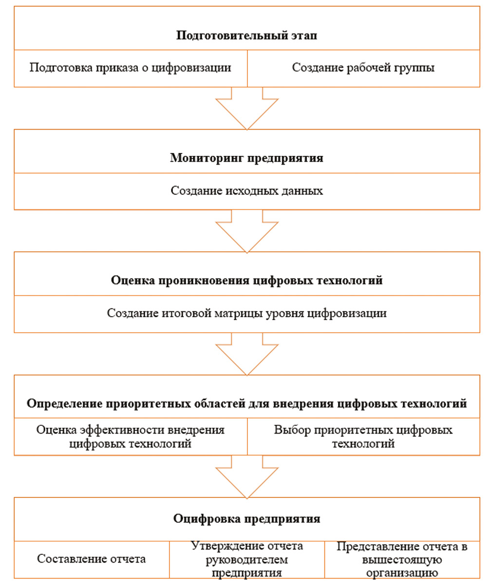 Результаты. В ходе исследования была разработана «дорожная карта» внедрения цифровых технологий на муниципальном предприятии, состоящая из подготовительного этапа; мониторинга предприятия; оценки проникновения цифровых технологий; определения приоритетных областей для внедрения цифровых технологий и оцифровки предприятия (рис. 1).