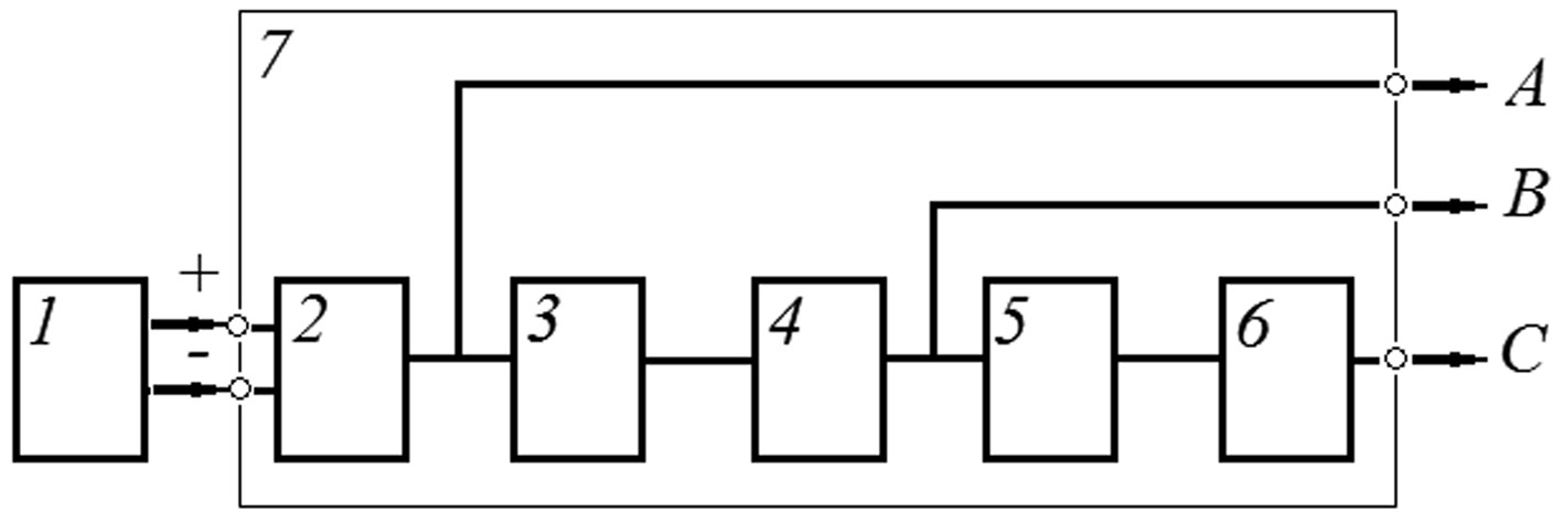 Рис. 1. Структурная схема источника трехфазного тока: 1 — источник постоянного тока; 2 — RC-автогенератор, содержащий однотранзисторный усилительный каскад и трехзвенный RC-четырехполюсник в цепи обратной связи; 3,5 — двухзвенный RC-фазовращатель; 4,6 — однотранзисторный усилительный каскад; 7 — источник трехфазного тока