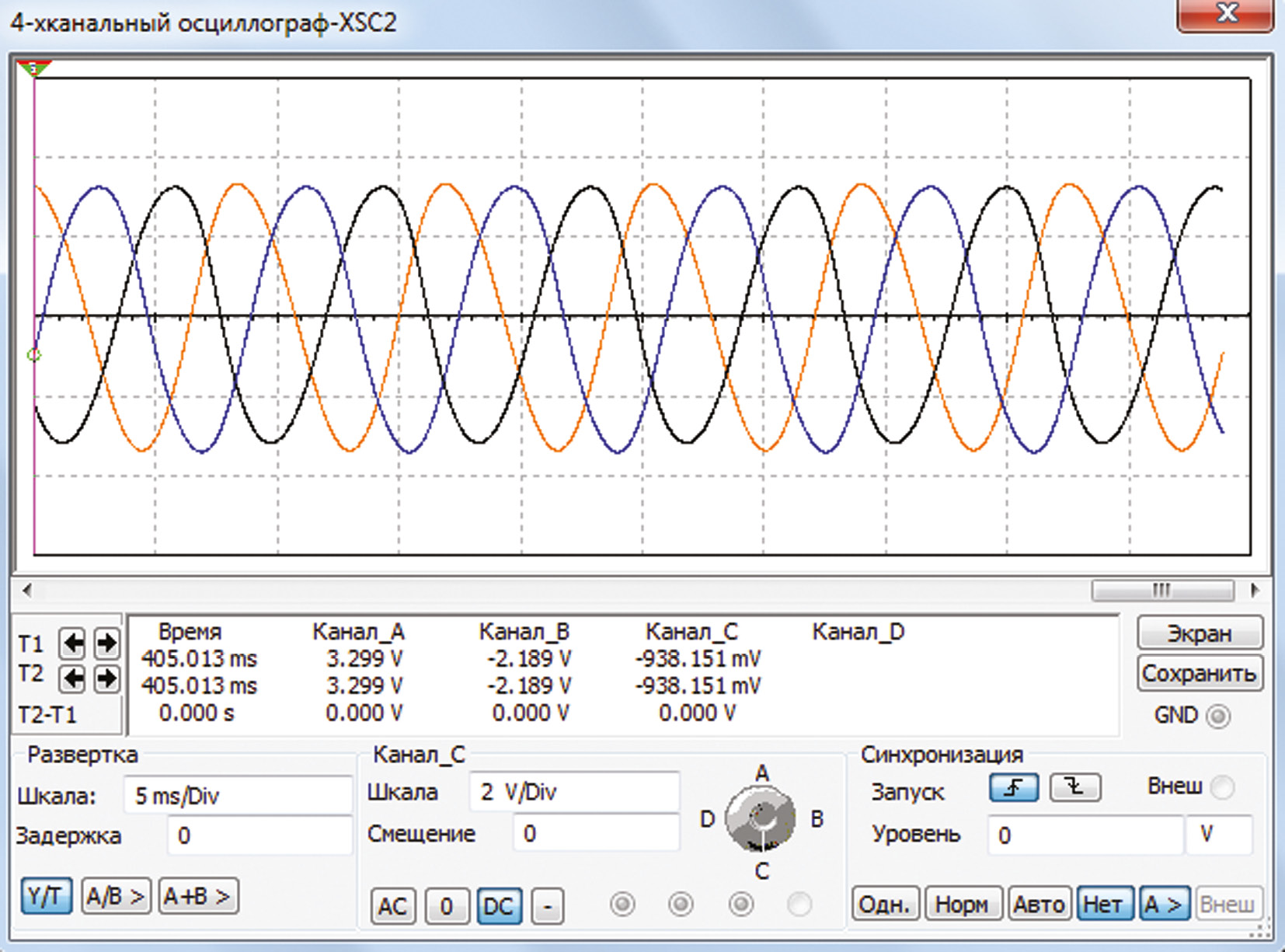 Трехзвенный RC-четырехполюсник обеспечивает фазовый сдвиг между напряжениями на его входе и выходе ψ = 180°. Фазовый сдвиг одного звена составляет 60°, чем обеспечивается условие баланса фаз [2]. На заданной частоте колебаний ω величины R и C выбираются из условия RC=1/. Ослабление сигнала, вносимое трехзвенным RC-четырехполюсником, компенсируется усилительным каскадом, чем достигается баланс амплитуд. Синусоидальный сигнал поступает на входы двухзвенных фазовращателей, обеспечивающих фазовый сдвиг напряжений ψ = –120°. Частота синусоидального тока задается параметрами элементов схемы. Осциллограммы выходных напряжений приведены на рис. 2.