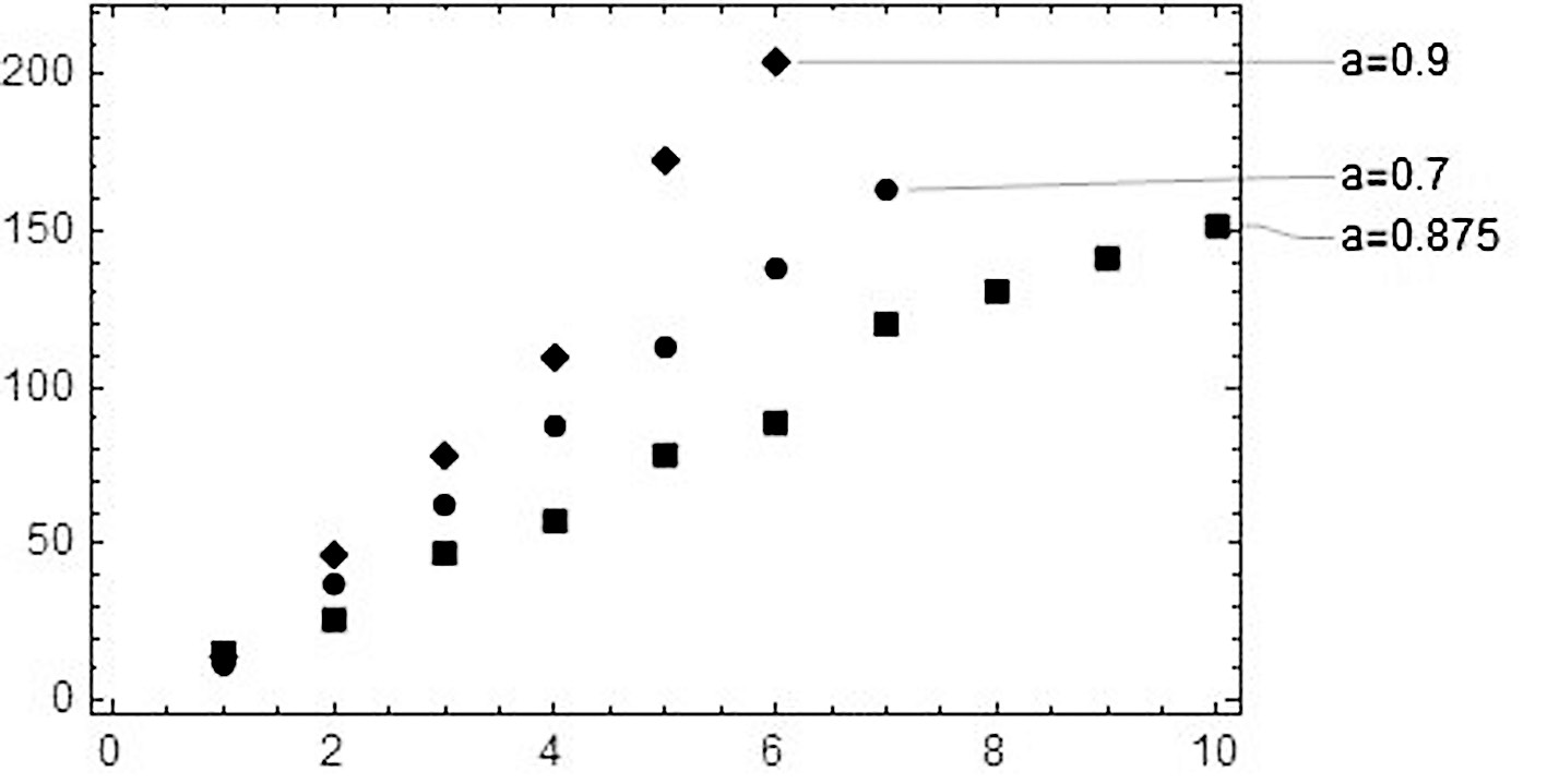 n = 1, a = 0,75 | ξ | 15,264 | 25,919 | 46,97 | 57,478 | 78,453 |