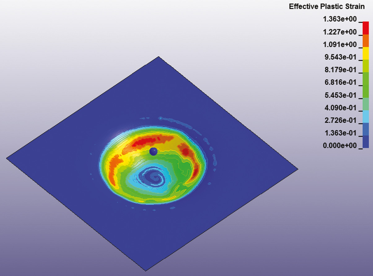 Выводы. Определена зависимость толщины и пластической деформации готового изделия, а также усилия при формообразовании от различных параметров (шаг, диаметр пуансона, траектория движения пуансона, трение, скорость формообразования). Разработана регрессионная модель, позволяющая комплексно оценить влияние основных технологических параметров на качество титановых имплантатов. Путем множественных компьютерных анализов подобран оптимальный набор параметров для инкрементального формообразования имплантатов, устраняющих дефекты свода черепа.