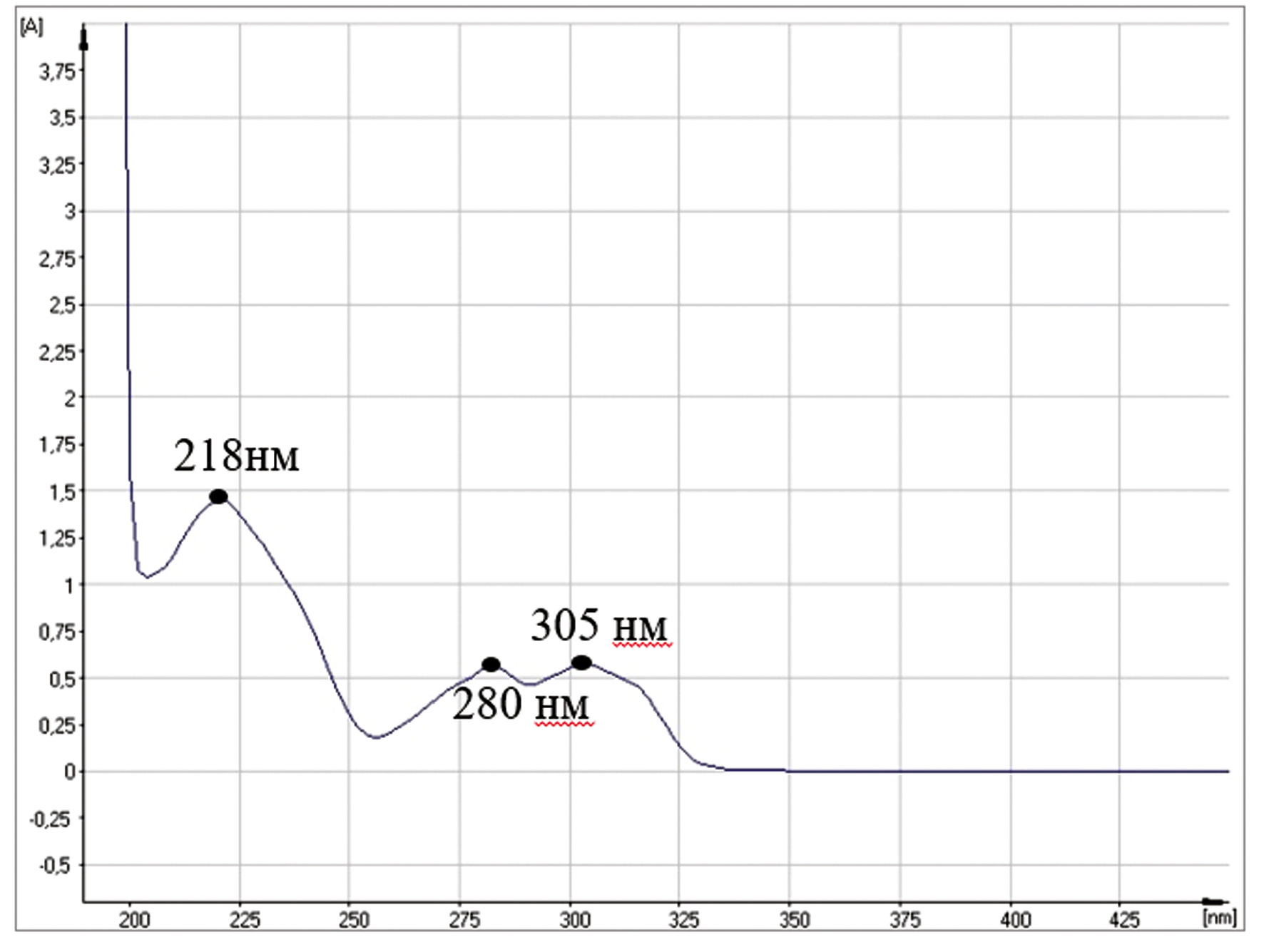 Результаты исследования показали, что оптимальными параметрами экстракции являются: степень измельчения сырья до размера частиц 2 мм, однократное извлечение 70 % этиловым спиртом на кипящей водяной бане в течение 45 мин в соотношении «сырье : экстрагент» — 1 : 30. Ультрафиолетовый спектр извлечения из травы мачка желтого имеет 3 характерных максимума: 218, 280 и 305 нм, также в диагностике глауцина имеет значение характер кривой поглощения (рис.).
