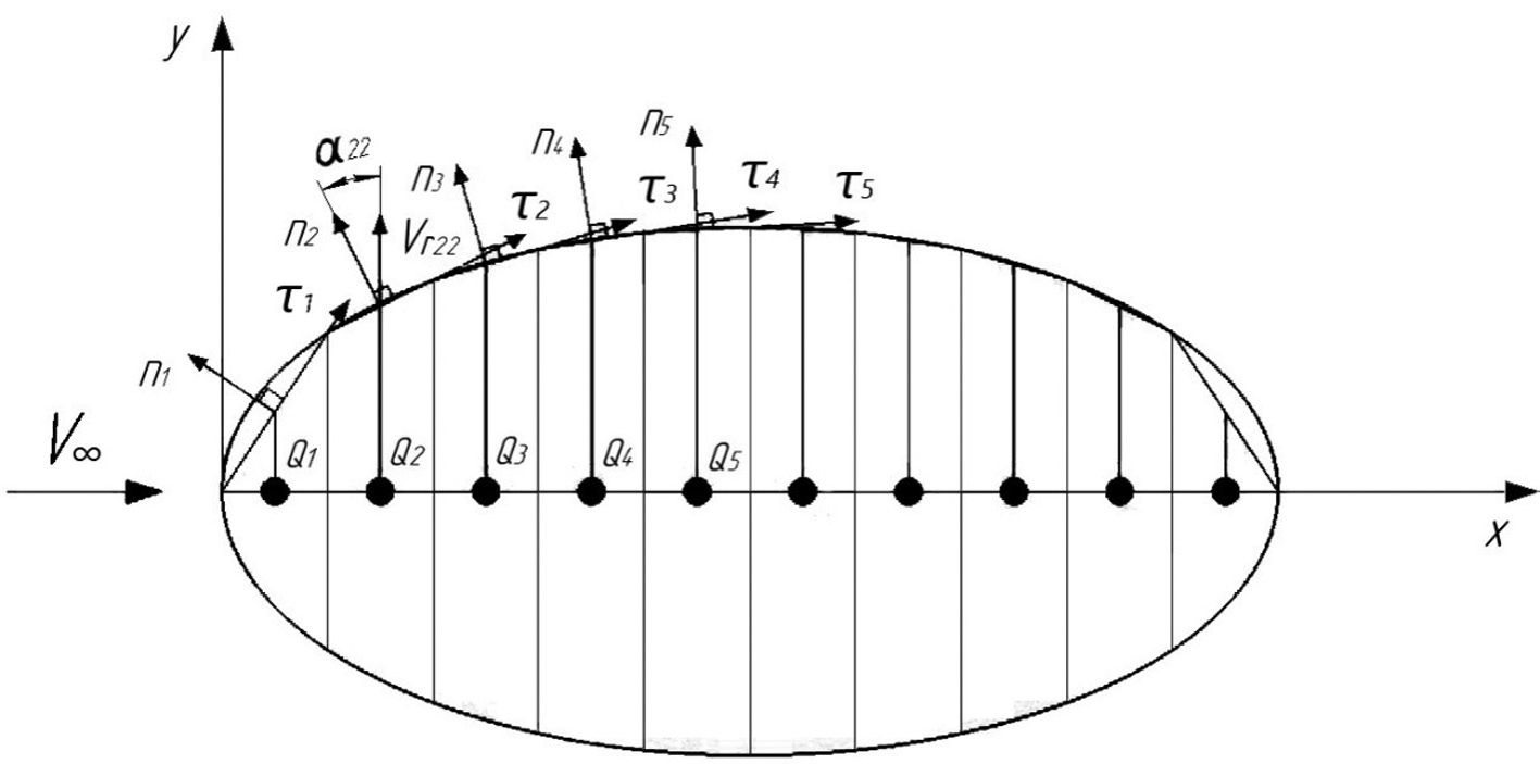 Методы. Основная идея метода состоит в нахождении величин интенсивностей пространственных источников-стоков, которые располагаются на оси симметрии тела. Исследуемое осесимметричное тело можно задать на плоскости в виде меридионального сечения с его осью симметрии (рис. 1). Поверхность сечения разбивалась на сегменты, в которых использовались усеченные конусы, на боковой поверхности которых определялось положение нормалей. Пересечение нормалей с образующей тела будем называть контрольными точками.