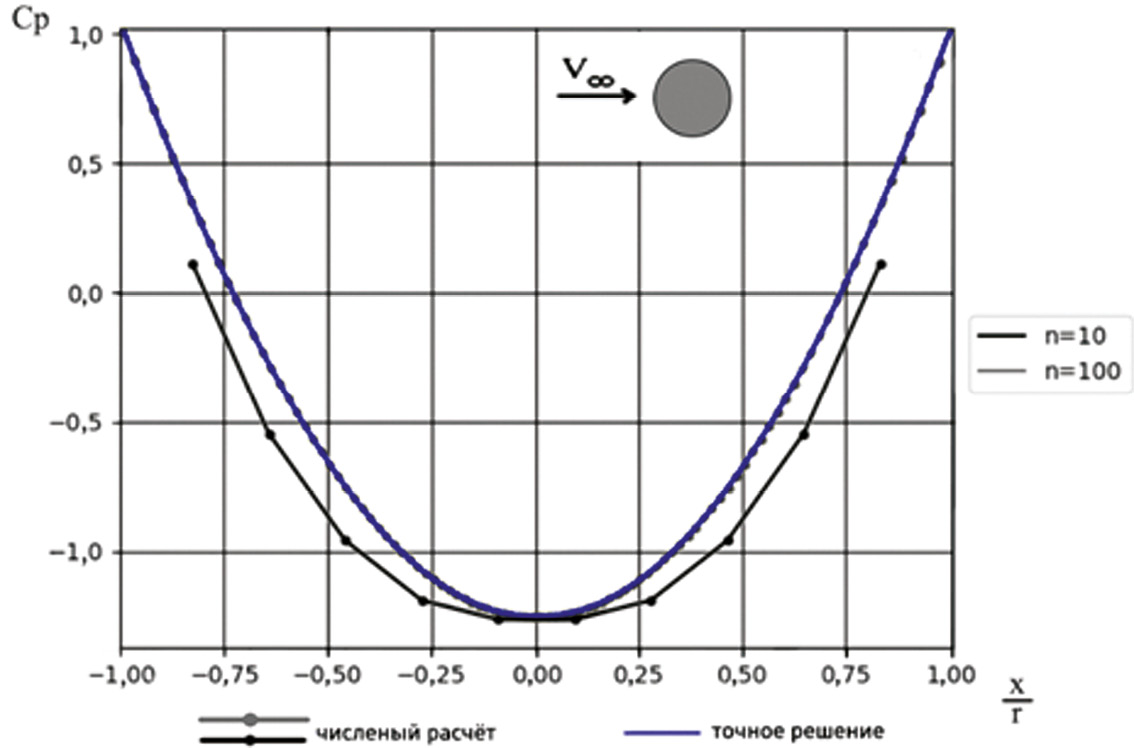 Результаты. В качестве теста для отладки математической модели и вычислительной программы выбрана сфера. На рис. 2 показано сравнение теоретического распределения коэффициента давления Cp и полученного расчетным путем при 10 и 100 особенностях, размещенных равномерно вдоль продольной оси сферы. Из рис. 2 следует, что расчет при 100 особенностях практически совпадает с теоретическим результатом.