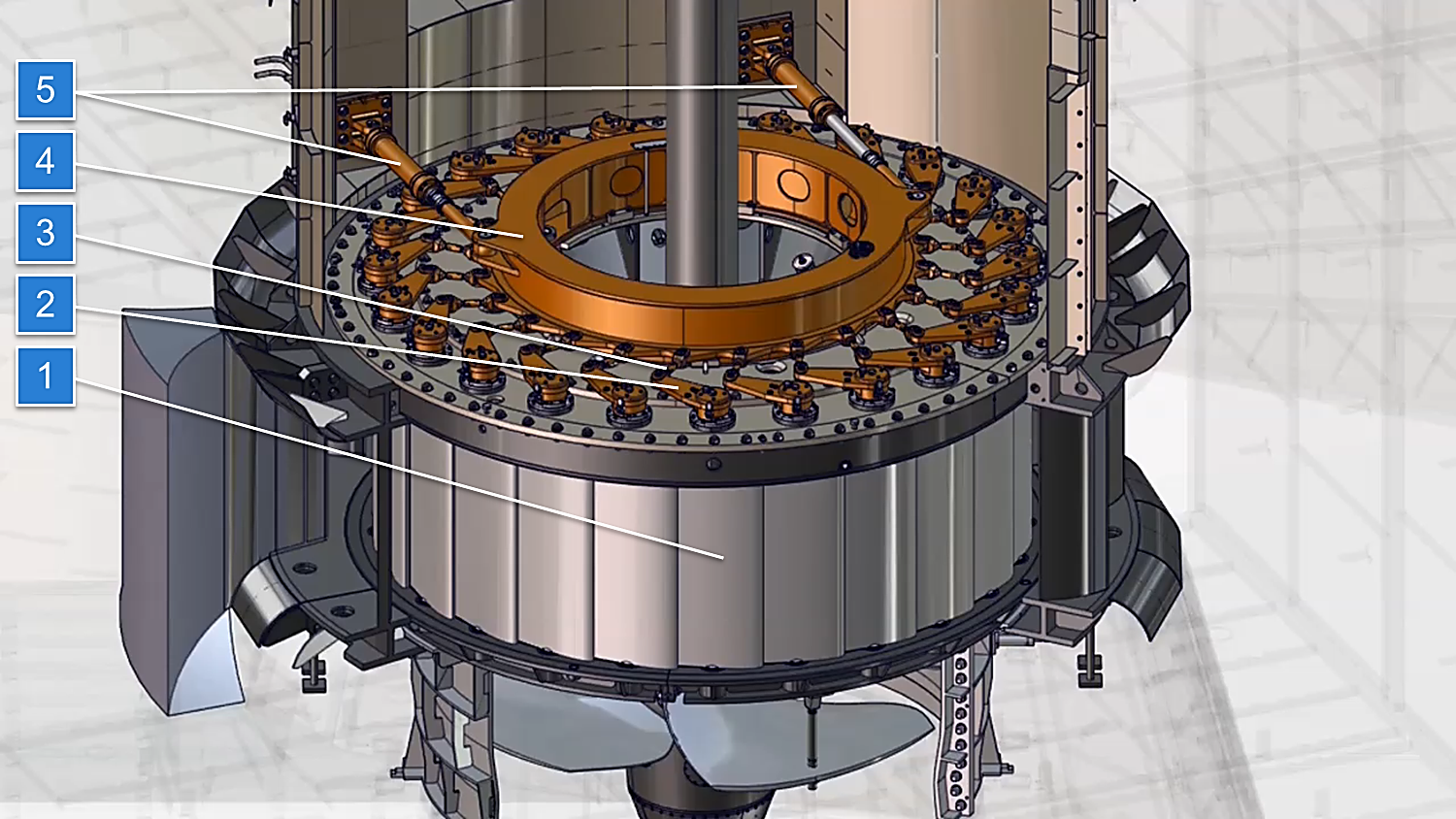 Обоснование. Гидравлическая турбина является машиной, при помощи которой энергия потока воды преобразуется в механическую энергию вращения вала. Направляющий аппарат является регулирующим органом, который подводит поток к рабочему колесу, а также контролирует расход через турбину. Основными его частями (рис. 1) являются: лопатка (1), накладка (2), серьга (3), регулирующее кольцо (4) и силовые приводы (5).