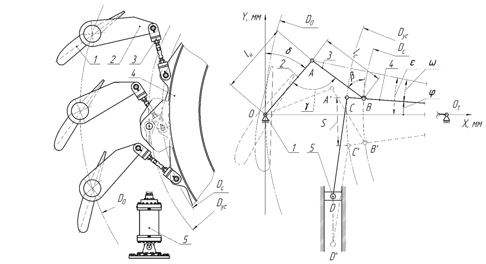 Методы. Расчет кинематических характеристик. В первую очередь определяются кинематические характеристики механизма поворота лопаток (см. рис. 2), которые представляют из себя: