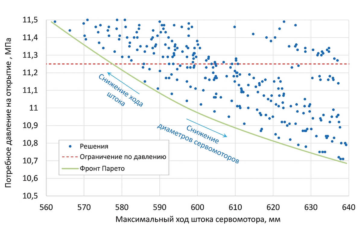 Итоговый вариант принимается при анализе по следующим критериям. Если невозможно снизить потребное давление без значительного повышения хода штока силового привода до таких значений, чтобы можно было перейти на более выгодный типоразмер сервомотора или даже маслонапорной установки, то ограничение по давлению ниже допускаемого не имеет смысла. В таком случае анализ сводится к тому, чтобы выбрать вариант с минимальным ходом штока. В таком случае теоретически оптимальный вариант находится в точке пересечения условного фронта Парето и ограничения по давлению в сервомоторах.