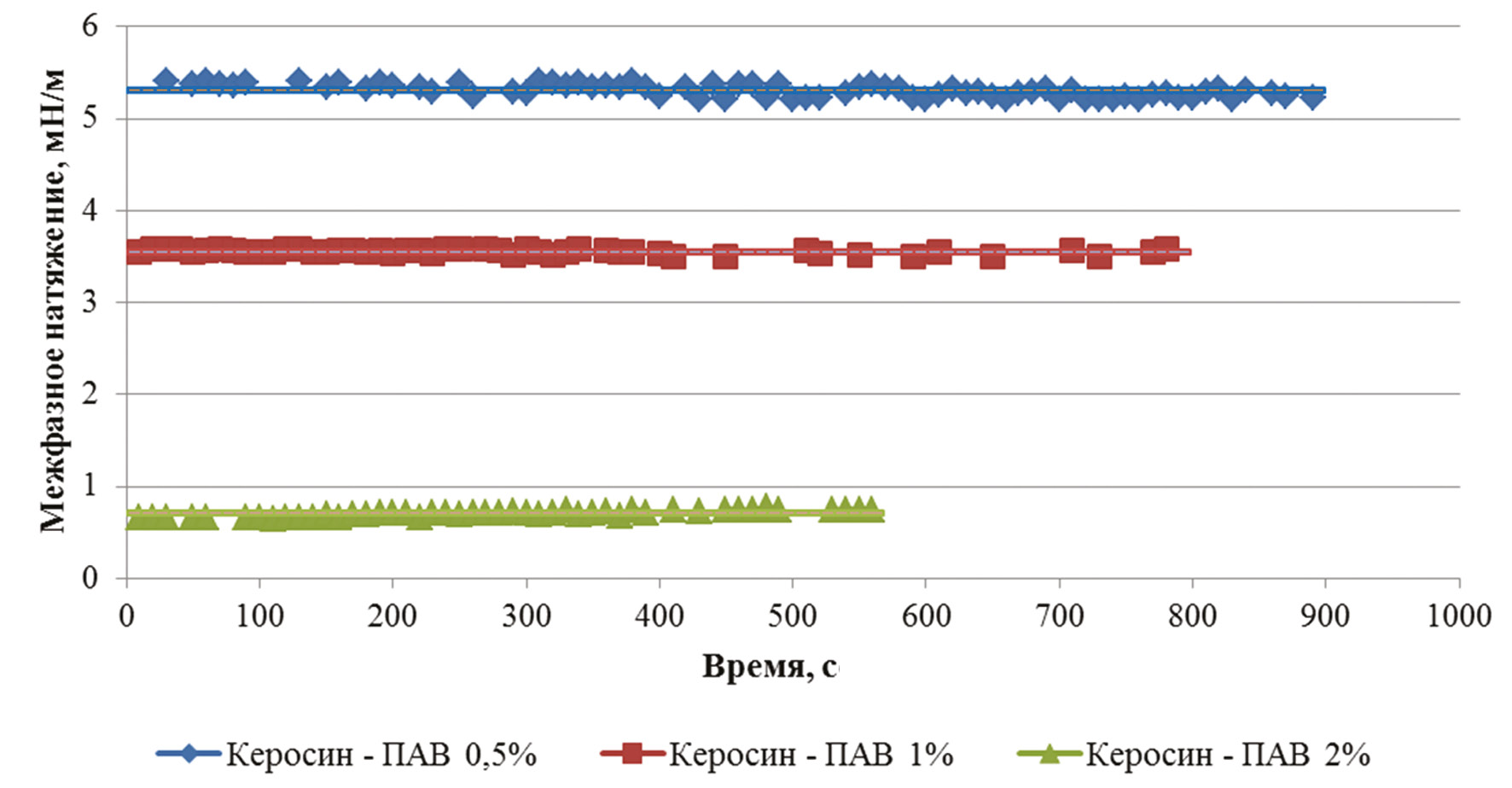 Поверхностную активность полученного состава определяли путем измерения межфазного натяжения на границах «керосин — водный раствор ПАВ». Для проведения измерений приготовили водные растворы ПАВ концентрациями 0,5, 1 и 2 % масс. Измерения проводили на видеотензиометре вращающейся капли Spinning Drop Video Tensiometer SVT15 (Data Physics). Результаты измерений представлены на рис. 1.