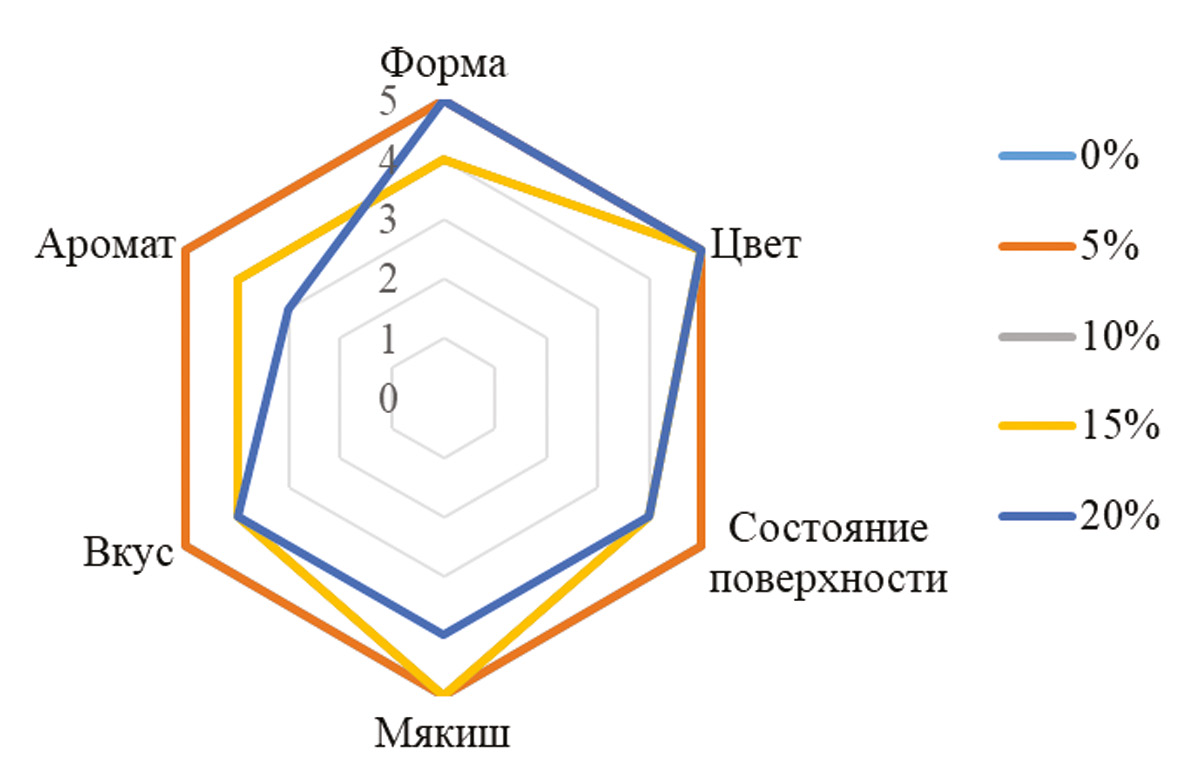 В ходе исследования для оценки органолептических свойств изделий была создана экспертная комиссия в количестве 10 человек, являющихся потенциальными потребителями. Оценивались показатели качества изделий по пятибалльной шкале. По итогам был рассчитан средний балл, построена профилограмма (рис. 1).
