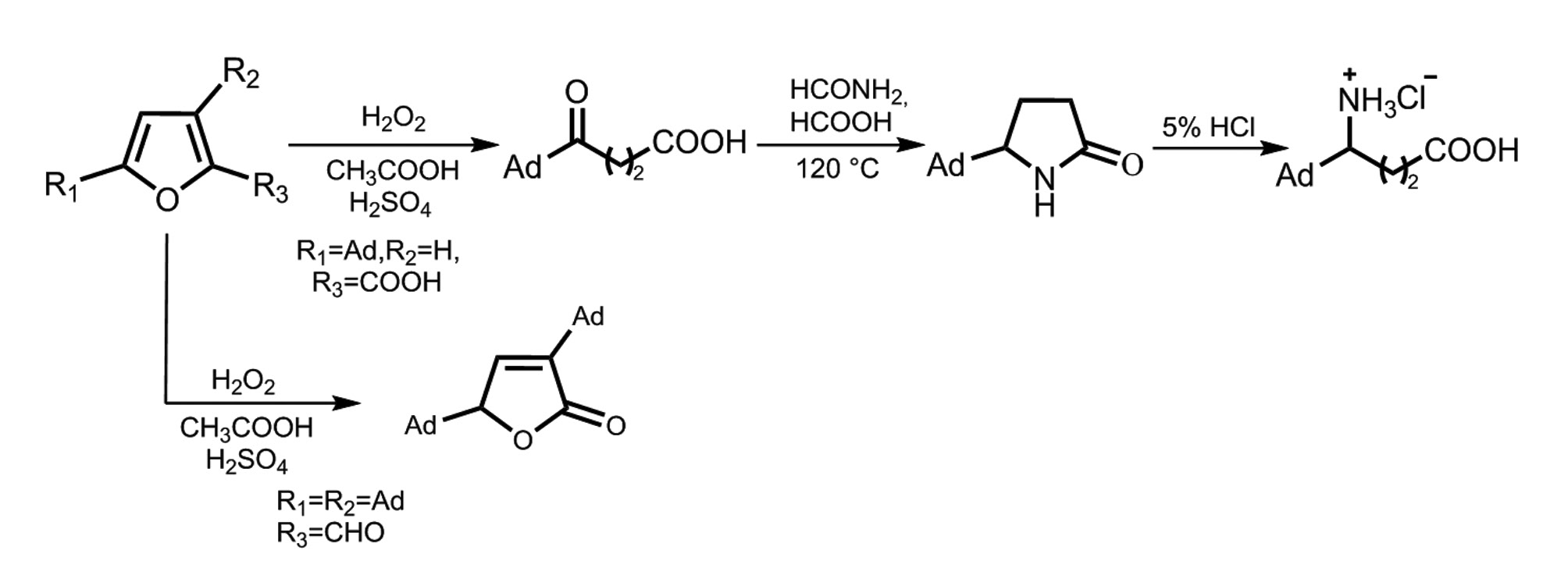 Предварительное исследование окислительного расщепления полученных адамантилфуранов было проведено на двух примерах: 5-моноадамантилированной пирослизевой кислоты и 3,5-диадамантилированного фурфурола. В первом случае была получена γ-оксокислота, которую далее вводили в реакцию с формамидом, в результате чего был получен 5-адамантилпирролидон, гидролиз которого приводит к гидрохлориду адамантилированной ГАМК. Испытания данного соединения на биологических моделях выявили антидепрессантную и противотревожную активность [2]. При попытке расщепления 2,5-диадамантилфурфурола в аналогичных условиях был получен фуран-2(5H)-он (рис. 3).