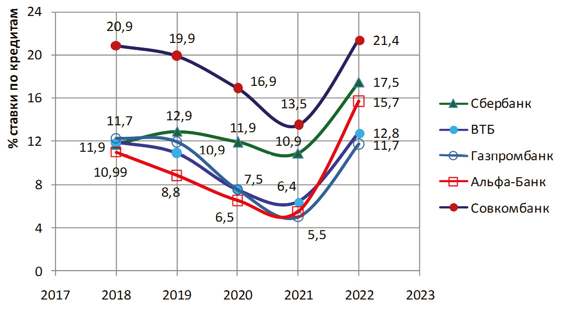 Результаты. На основании проведенного статистического анализа уровня кредитных ставок, предлагаемых банками населению за последние 5 лет установлено, что процентные ставки по потребительским кредитам для физических лиц в период с 2018 по 2021 год планомерно снижались, а в 2022 резко повысились вслед за усугублением геополитической ситуации в стране (рис. 1). Данная тенденция была продиктована изменением ключевой ставки, установленной Центральным банком России. Наименьший процент по кредиту был предоставлен клиентам Альфа-банка. Высокие процентные ставки Совкомбанка – связаны с более рискованной кредитной политикой банка.