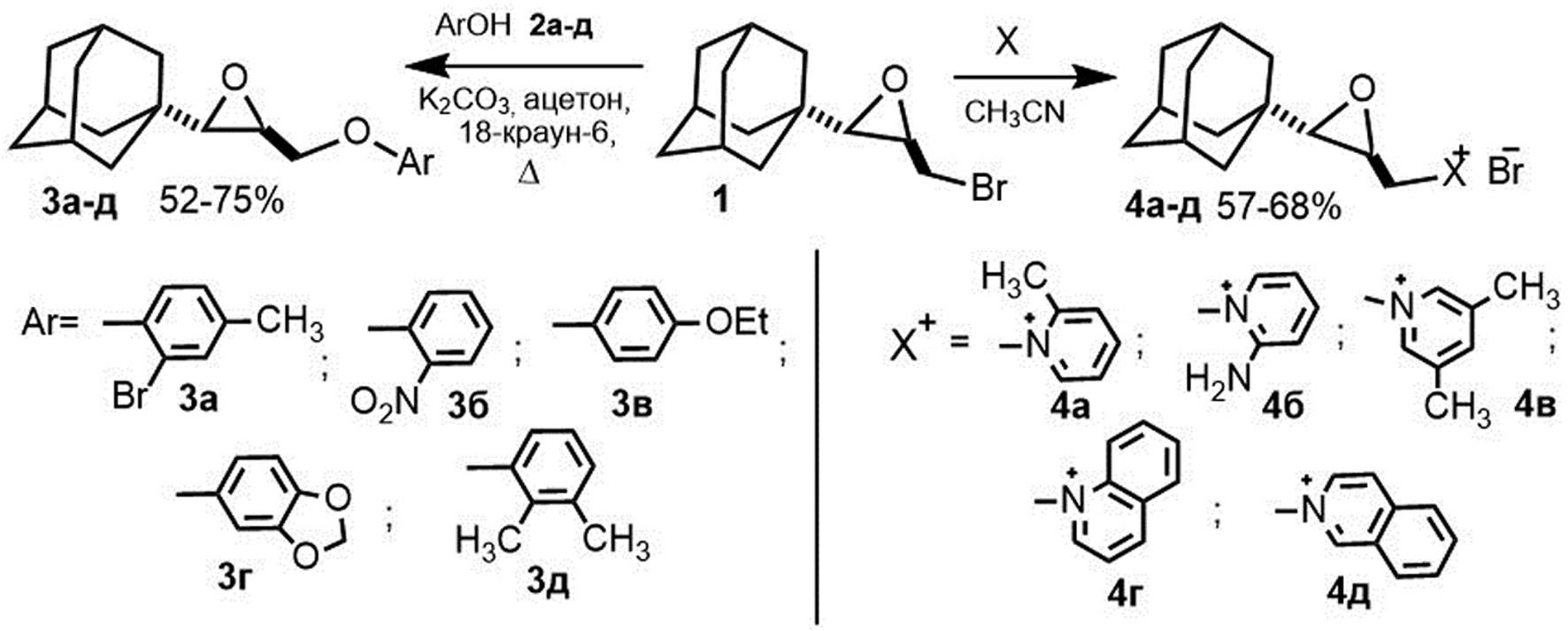 Результаты. Синтез ключевого соединения транс-2-(адамантан-1-ил)-3-бромметилоксирана (1) осуществляли по методике [3]. В дальнейшем O-алкилированием соответствующих фенолов (2а-д) бромметилоксираном (1) получен ряд арилоксиметилоксиранов адамантанового ряда (3а-д). Взаимодействием бромметилоксирана (1) с производными пиридина в ацетонитриле были синтезированы соединения (4а-д) (рис. 1).