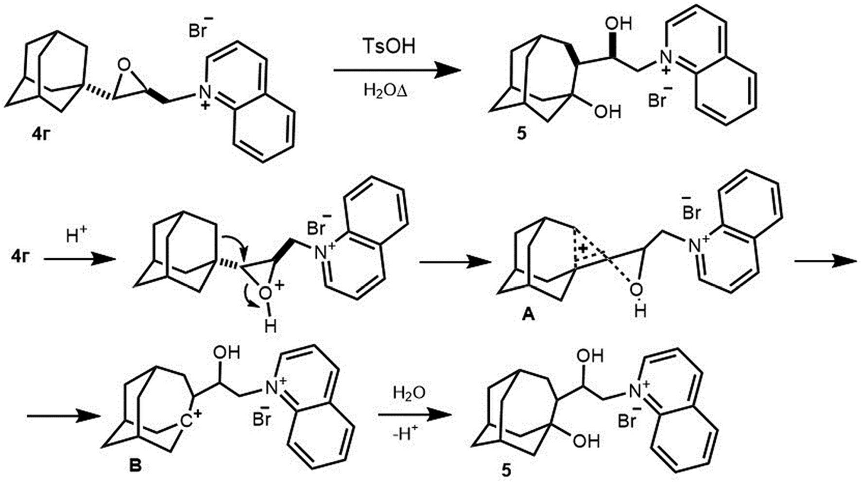 Проведена реакция раскрытия оксиранового цикла бромида 1-{[(2S,3S)-3-адамантан-1-ил)oксиран-2-ил]метил}-1-хинолиния (4г), катализируемая п-толуолсульфокислотой. В результате получен продукт скелетной перегруппировки — диол гомоадамантановой структуры (5) (рис. 2).